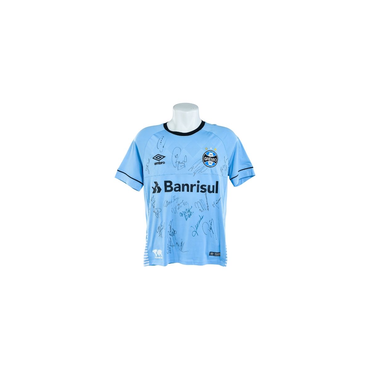 O modelo apresenta tecido tecnológico com padronagem discreta em relevo, mangas curtas e caimento esportivo. No peito, destacam-se o escudo do Grêmio com estrelas e o logotipo Umbro, além do patrocínio Banrisul em posição central. A camisa ganha ainda mais relevância por conter diversos autógrafos originais de jogadores, distribuídos pela parte frontal, transformando a peça em um item especial de coleção.