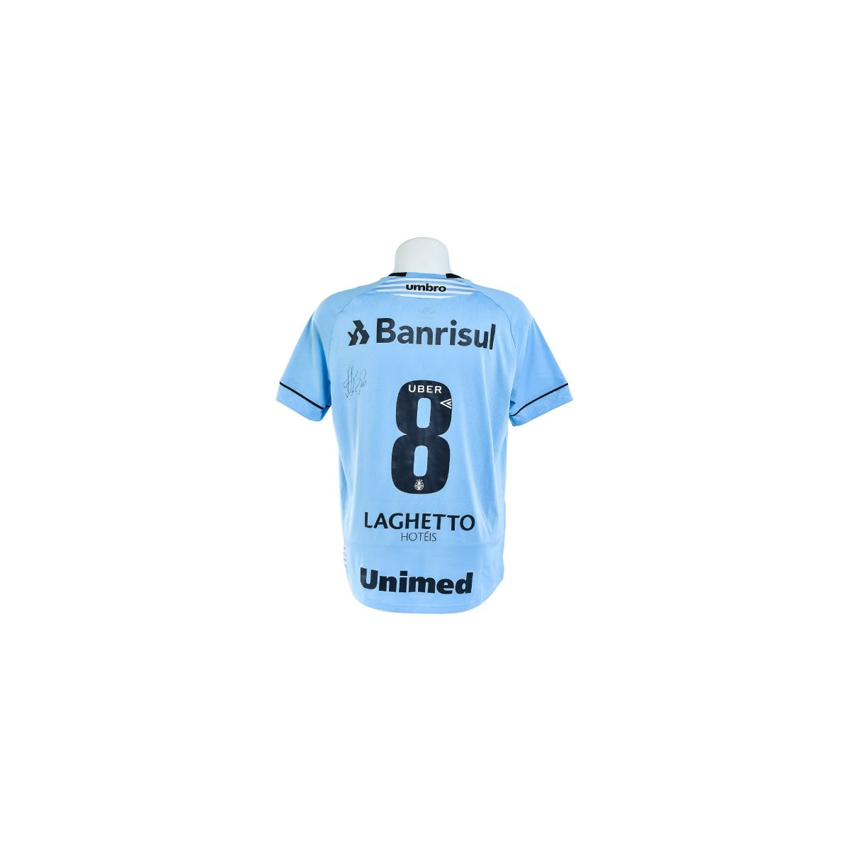 Camisas autografadas como esta possuem alto valor histórico e emocional, especialmente quando associadas a períodos recentes do clube. Este modelo azul-claro da Umbro tornou-se bastante apreciado por colecionadores por unir design moderno, múltiplos patrocinadores marcantes e assinaturas originais, transformando a peça em um verdadeiro item de memória do Grêmio contemporâneo.