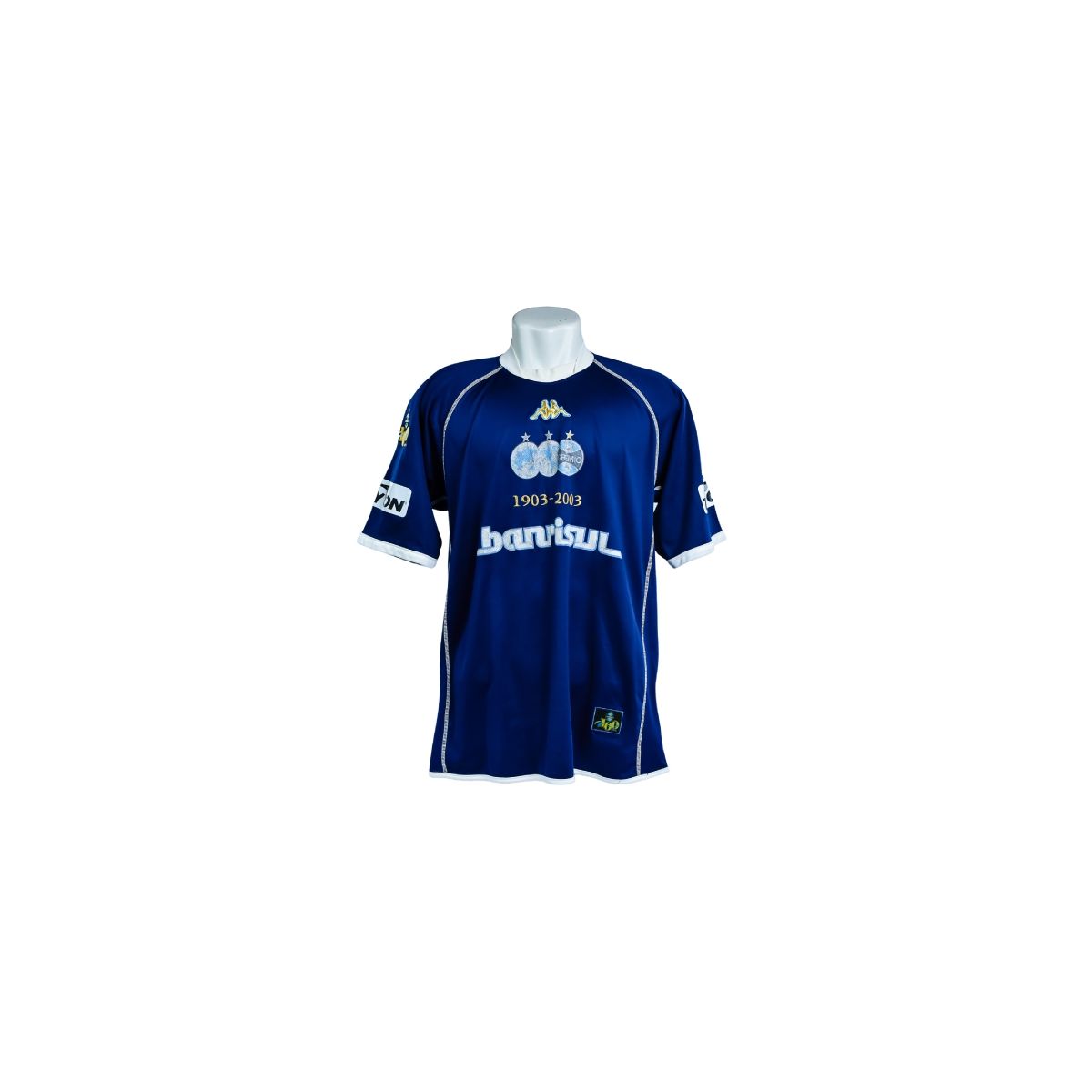 No peito, destacam-se o escudo especial do Grêmio alusivo ao centenário, o logotipo da Kappa, a inscrição “1903–2003” e o patrocínio Banrisul aplicado de forma centralizada. Esses elementos reforçam o caráter histórico e celebrativo da camisa.