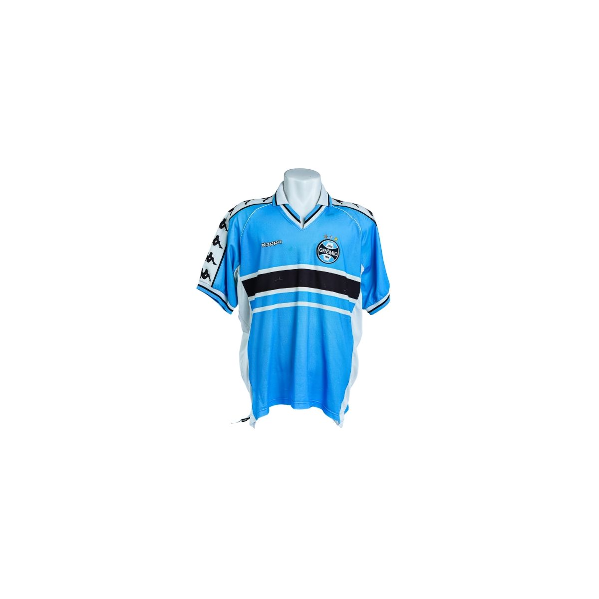 A camisa azul do Grêmio, fabricada pela Kappa, é um modelo marcante do final dos anos 1990 e início dos anos 2000, período em que o clube adotou uniformes com forte identidade visual e influência europeia. Com design esportivo e elegante, a peça representa uma fase importante da modernização estética do Tricolor Gaúcho.