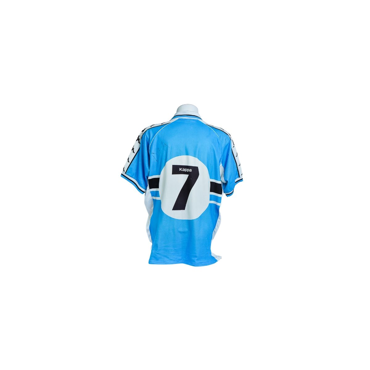 Nas costas, a camisa exibe a personalização com o número 7, aplicado em numeração preta sobre um círculo branco, com a marca Kappa integrada ao design. O conjunto remete a um estilo clássico e ao mesmo tempo ousado, típico dos uniformes europeus da época.