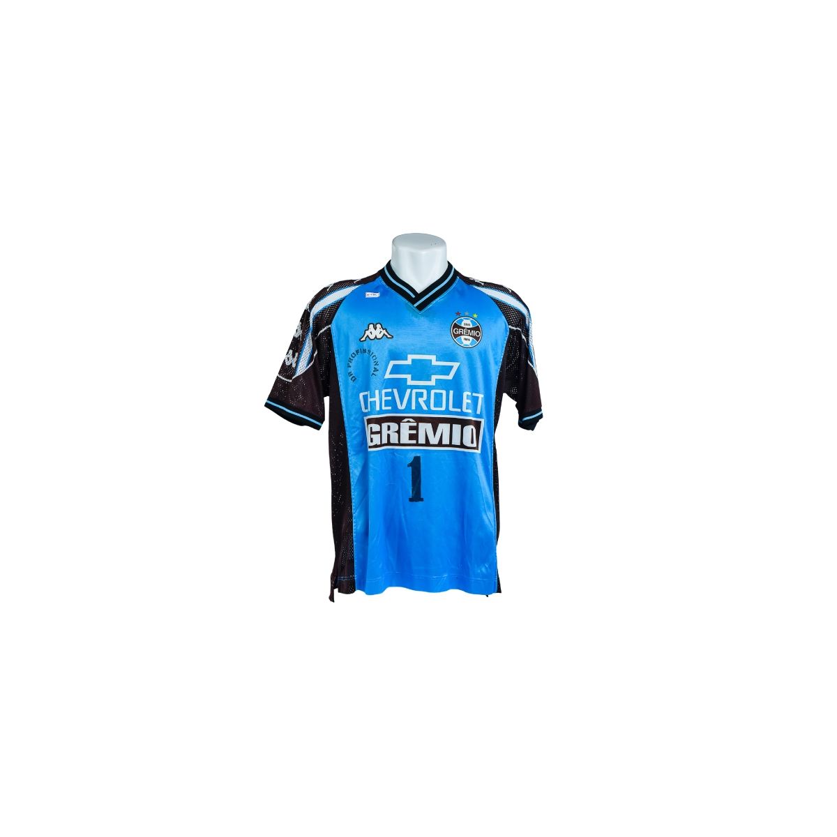 As camisas de goleiro do Grêmio produzidas pela Kappa são muito valorizadas por colecionadores devido ao design ousado e à forte identidade visual. Modelos como este, com patrocínio Chevrolet Grêmio e numeração clássica, representam uma era marcante do clube e refletem a estética arrojada do futebol do início dos anos 2000, tornando-se peças de grande valor histórico e simbólico.