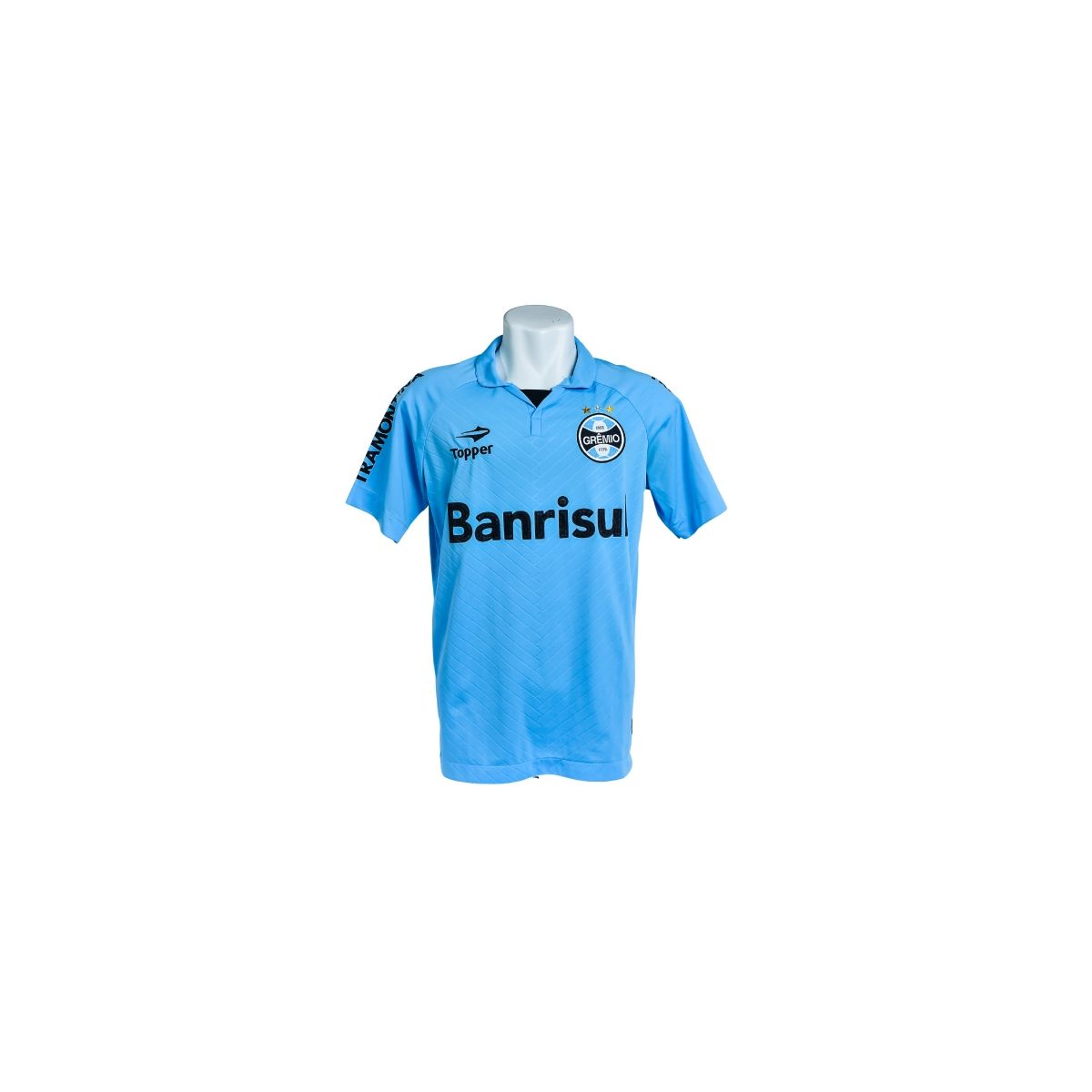 No peito, destacam-se o escudo do Grêmio com estrelas, o logotipo da Topper e o patrocínio Banrisul aplicado de forma centralizada, compondo um visual equilibrado e fiel aos padrões utilizados pelo clube naquele período.