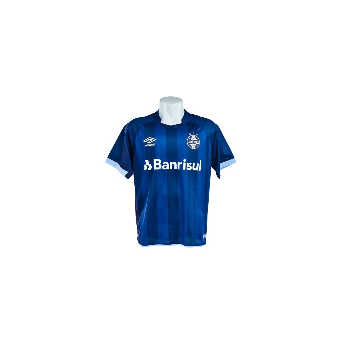 A camisa azul do Grêmio, fabricada pela Umbro, representa uma fase recente e extremamente vitoriosa do clube, marcada por consistência defensiva e alto nível competitivo. Com tonalidade azul escura e grafismos verticais sutis, o modelo apresenta um visual moderno, sóbrio e alinhado ao padrão dos uniformes contemporâneos.
