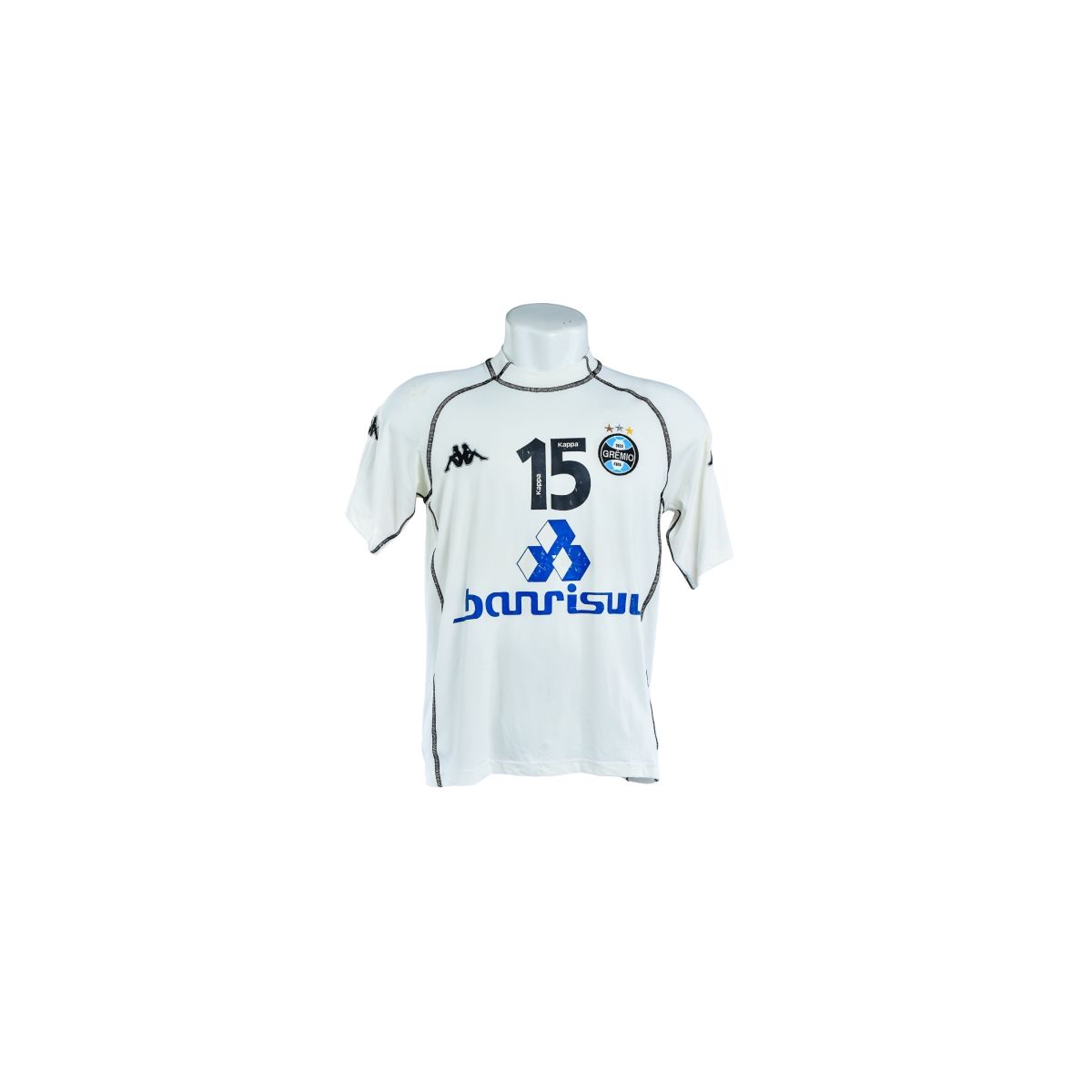 A camisa branca do Grêmio, fabricada pela Kappa, é um modelo marcante do início dos anos 2000, período em que os uniformes passaram a explorar cortes anatômicos e costuras aparentes como elementos de design. Com visual limpo e esportivo, a peça reforça a identidade tricolor por meio de detalhes técnicos e acabamento diferenciado.