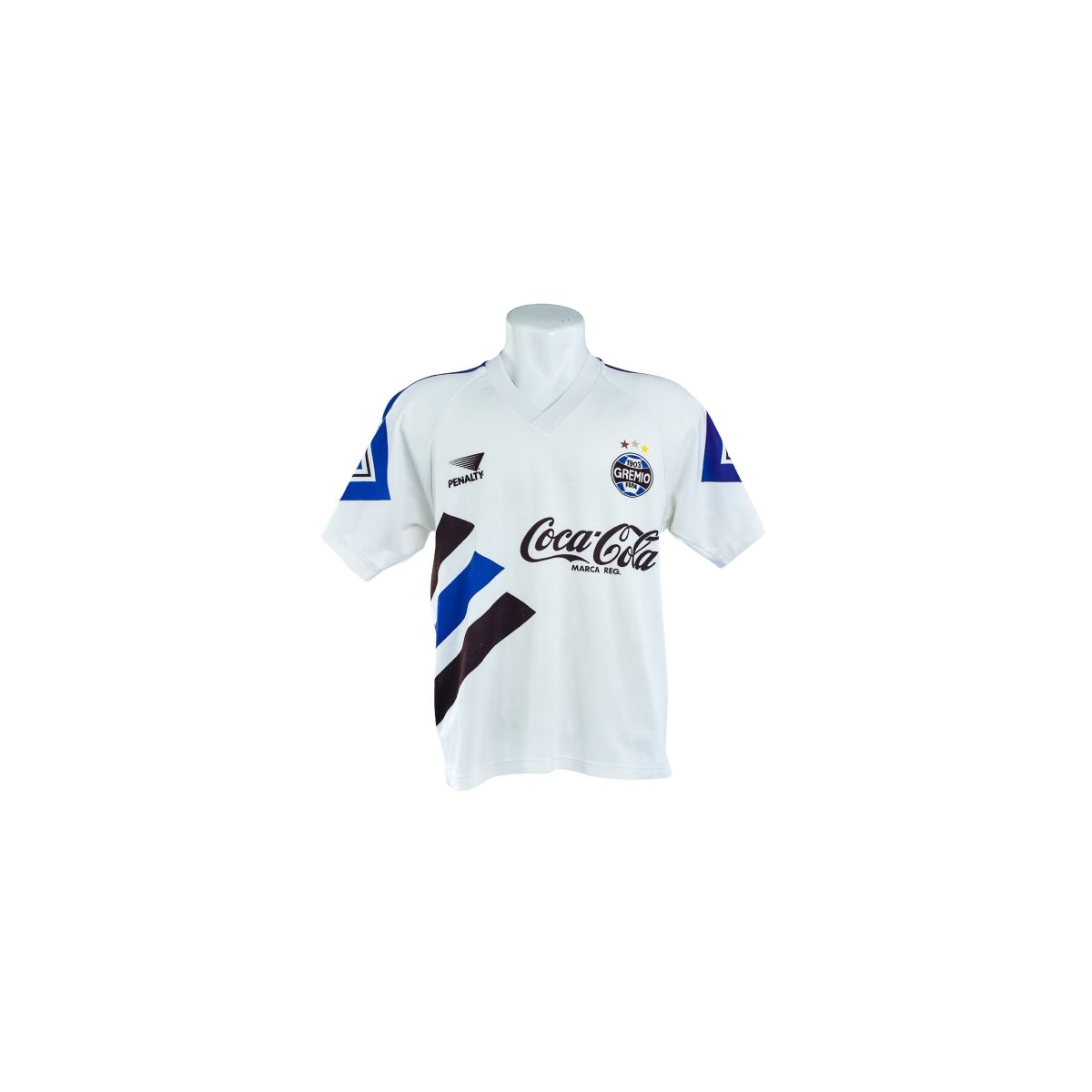 A camisa branca do Grêmio, fabricada pela Penalty, é um modelo marcante do início dos anos 1990, período em que o clube consolidava sua identidade visual moderna aliada a elementos gráficos ousados. Com forte presença do branco como cor base, o uniforme se destaca pelos detalhes geométricos em azul e preto aplicados de forma assimétrica, característica típica do design esportivo da época.