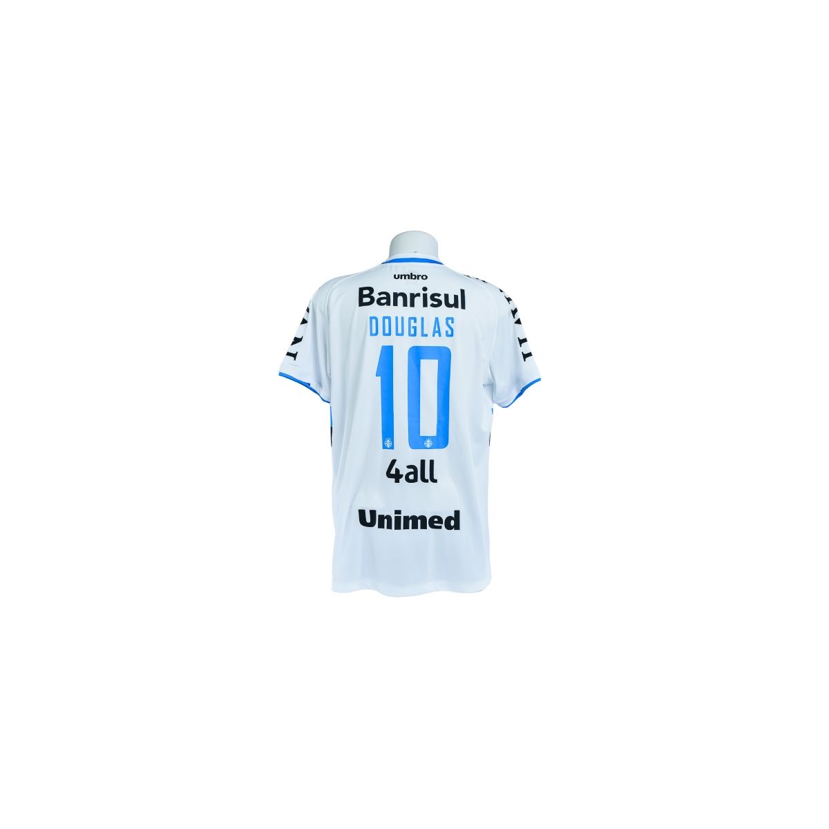 Nas costas, a camisa traz a personalização DOUGLAS #10, com numeração azul em fonte moderna e bem definida. Abaixo do número aparecem os patrocinadores 4all e Unimed, compondo o layout oficial utilizado em partidas da temporada.