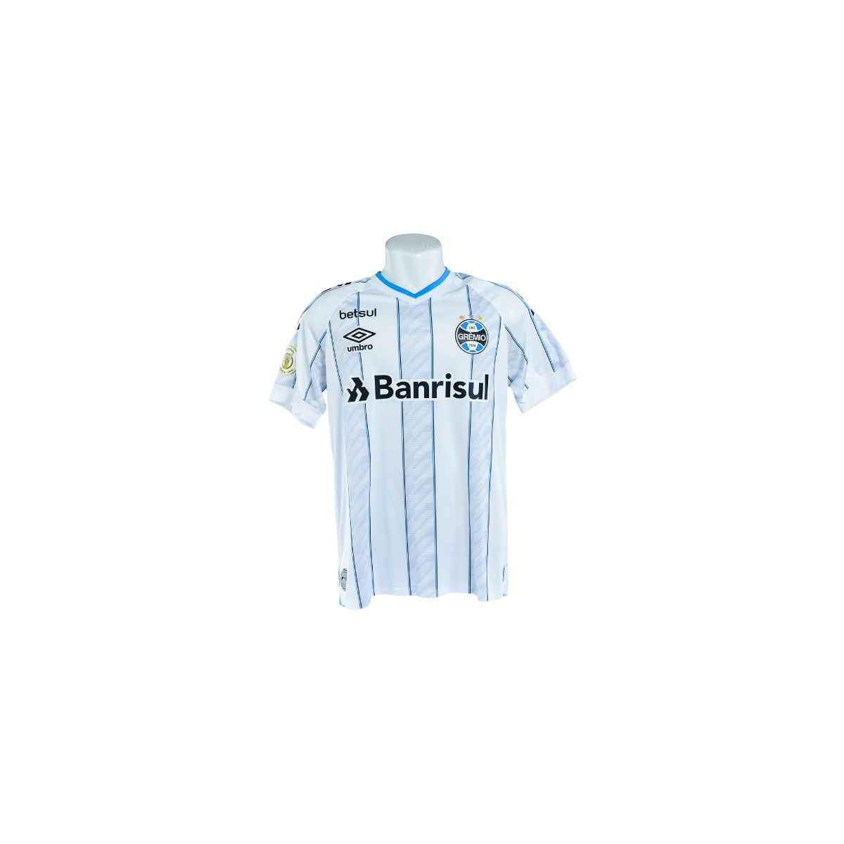 A camisa branca do Grêmio, fabricada pela Umbro, representa uma fase recente do clube marcada por competitividade, identidade forte e protagonismo defensivo. Com design moderno, o uniforme traz o branco predominante com listras verticais sutis em tons de azul, conferindo elegância e leveza visual sem perder a tradição tricolor.