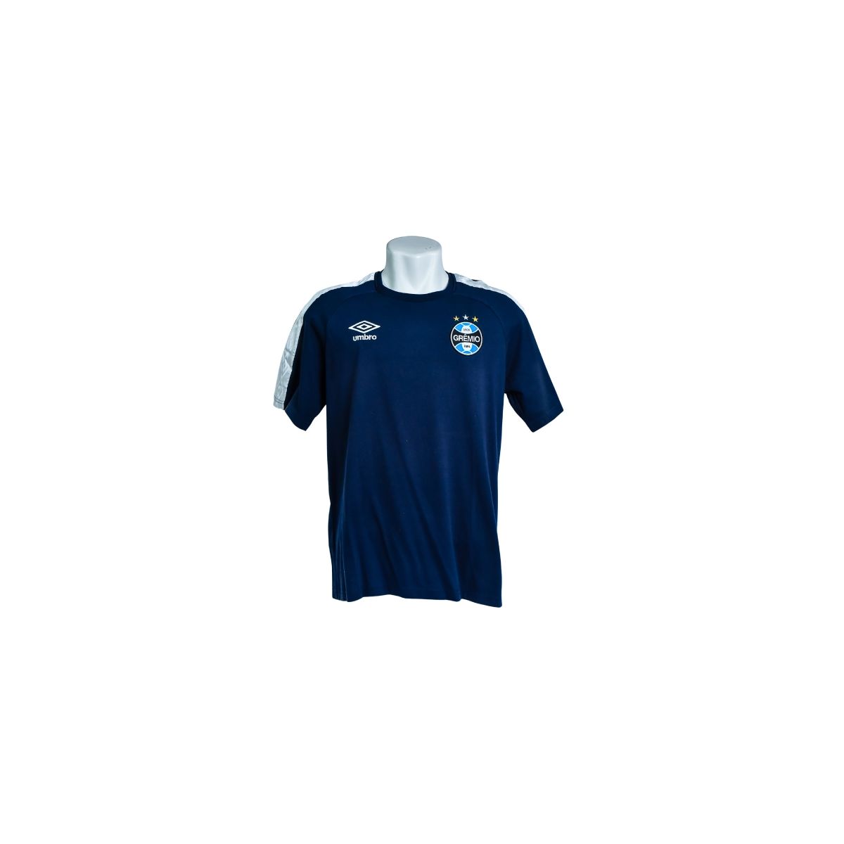 No peito, destacam-se o escudo do Grêmio com estrelas, posicionado no lado esquerdo, e o logotipo da Umbro no lado direito, compondo um visual equilibrado e institucional. A ausência de patrocínio frontal reforça o caráter de treino e concentração do modelo.