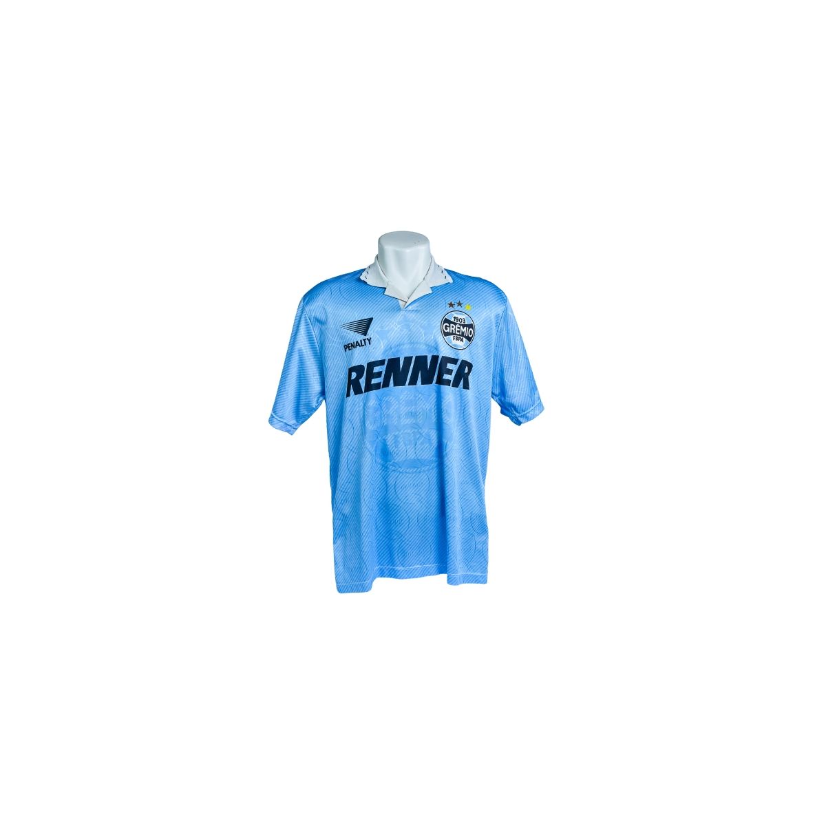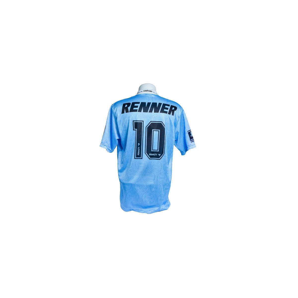 Na parte frontal, destacam-se o escudo do Grêmio com estrelas, o logotipo da Penalty e o patrocínio Renner aplicado de forma centralizada, criando um visual imponente e fiel aos padrões utilizados pelo clube naquele período.