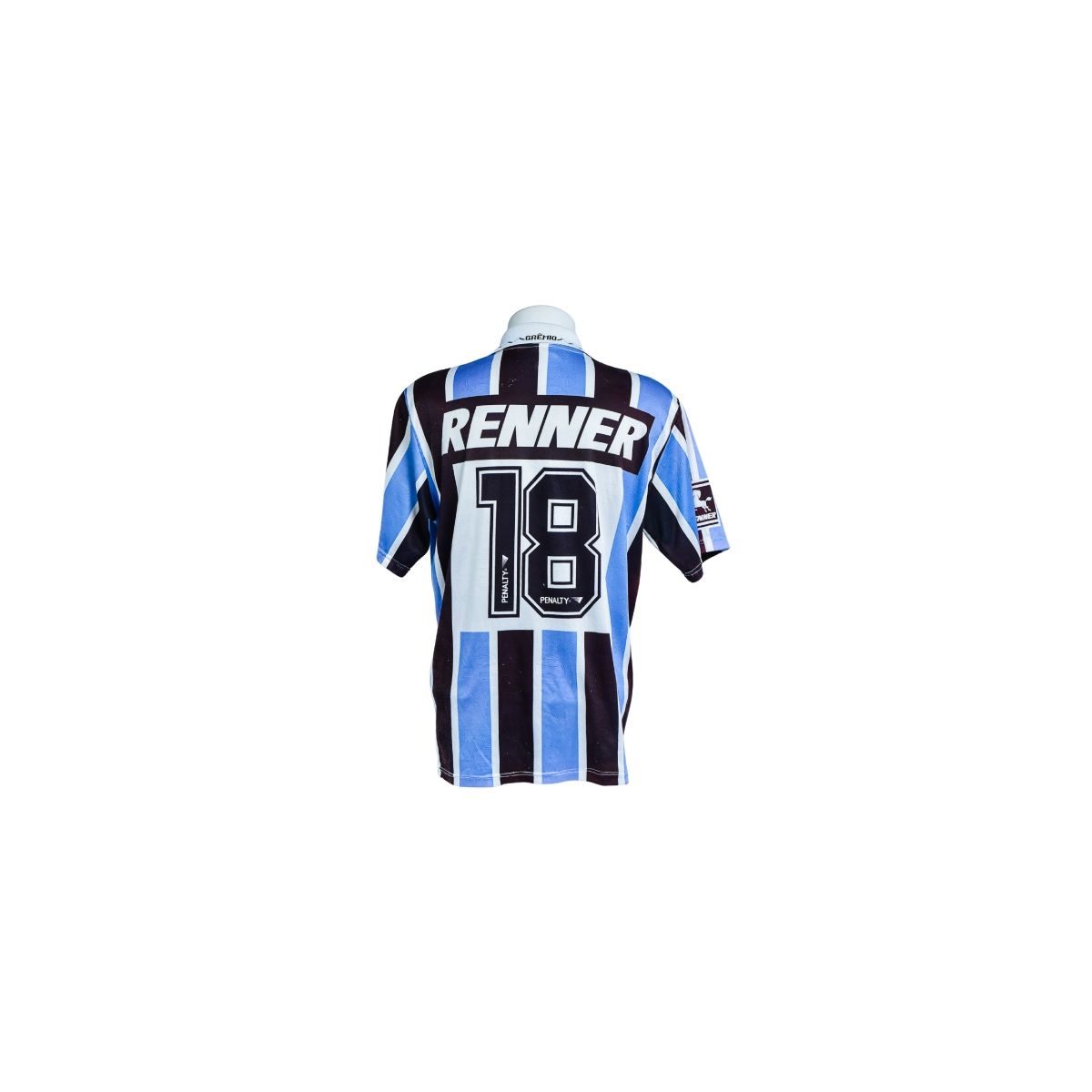 Nas costas, a camisa exibe a personalização #18, acompanhada do patrocínio Renner na parte superior. A numeração segue o padrão Penalty da época, com contornos bem definidos, garantindo ótima leitura e mantendo a estética tradicional do período.