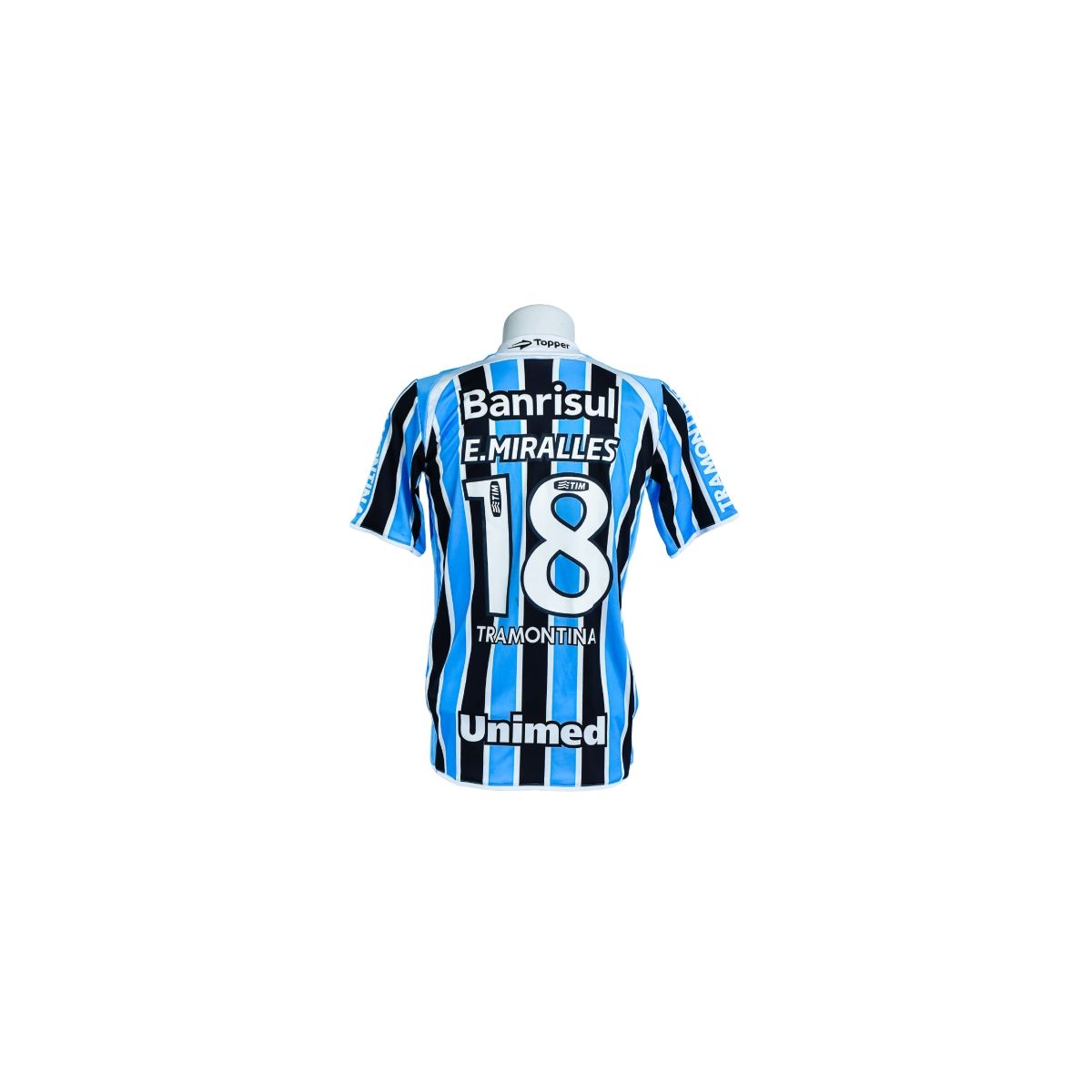 Nas costas, a camisa traz a personalização E. Miralles e o número 18, aplicados em numeração branca com contorno escuro. O conjunto é complementado pelos patrocínios Tramontina e Unimed, posicionados na parte inferior, conforme padrão utilizado pelo clube naquele período.