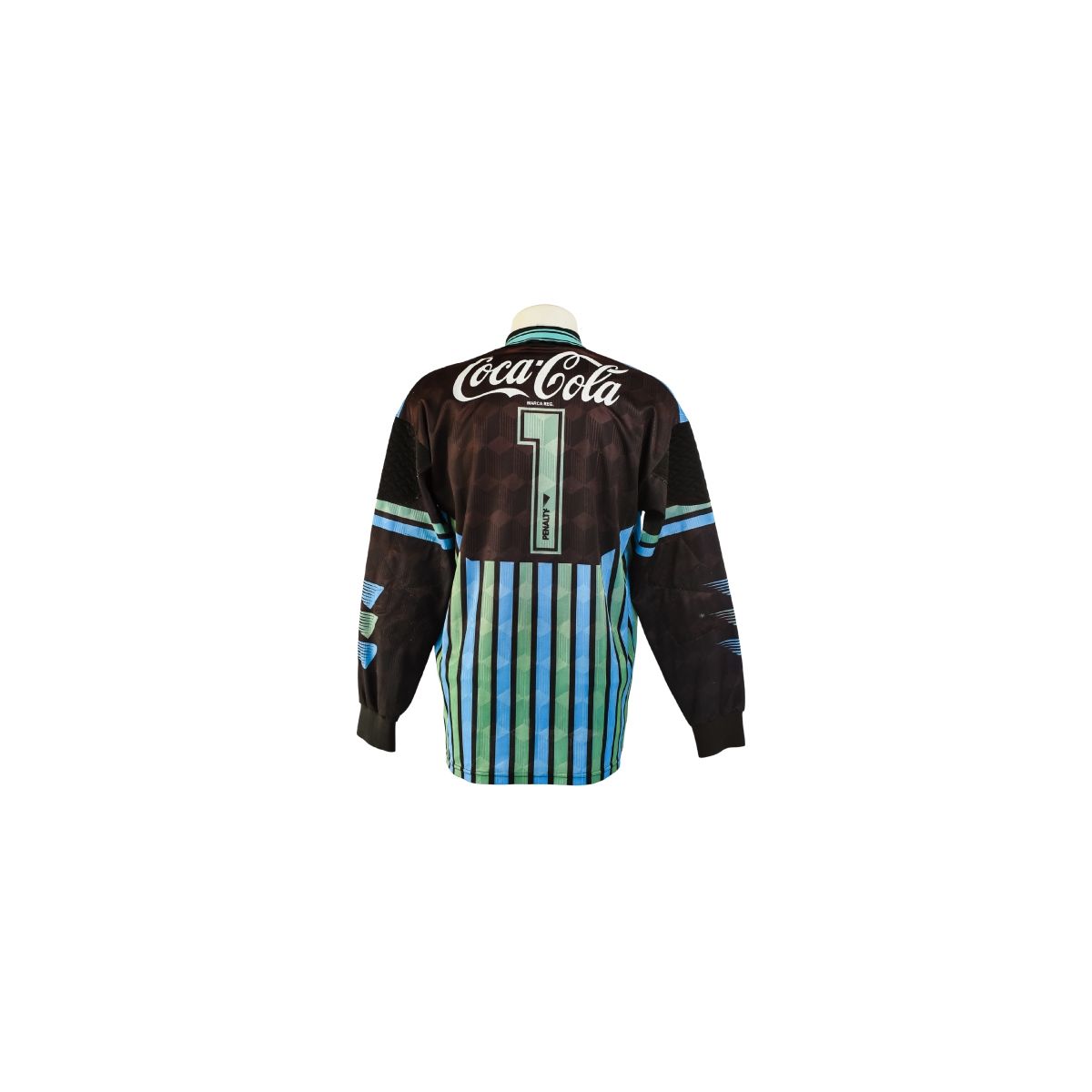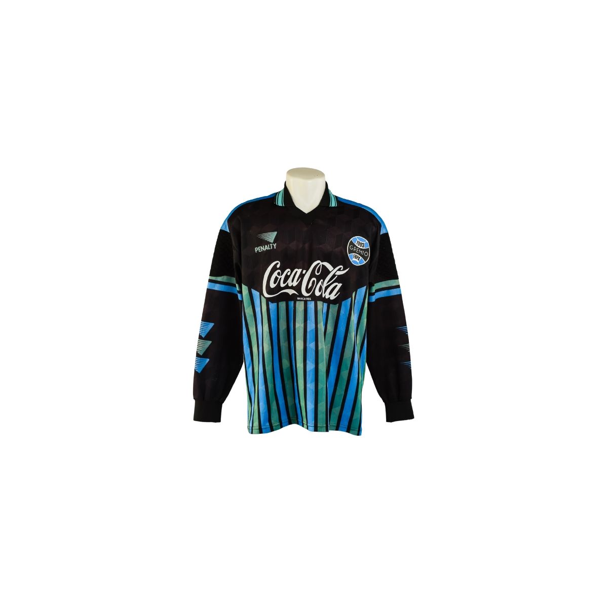 A camisa de goleiro do Grêmio Foot-Ball Porto Alegrense de 1992 , produzida pela Penalty , é uma das mais emblemáticas da transição entre o fim dos anos 80 e o início dos 90. Com o inconfundível patrocínio da Coca-Cola , esse modelo marcou época pela ousadia no design e pelo uso de formas geométricas em tons de azul, verde e preto , criando um efeito visual moderno e imponente para a época.