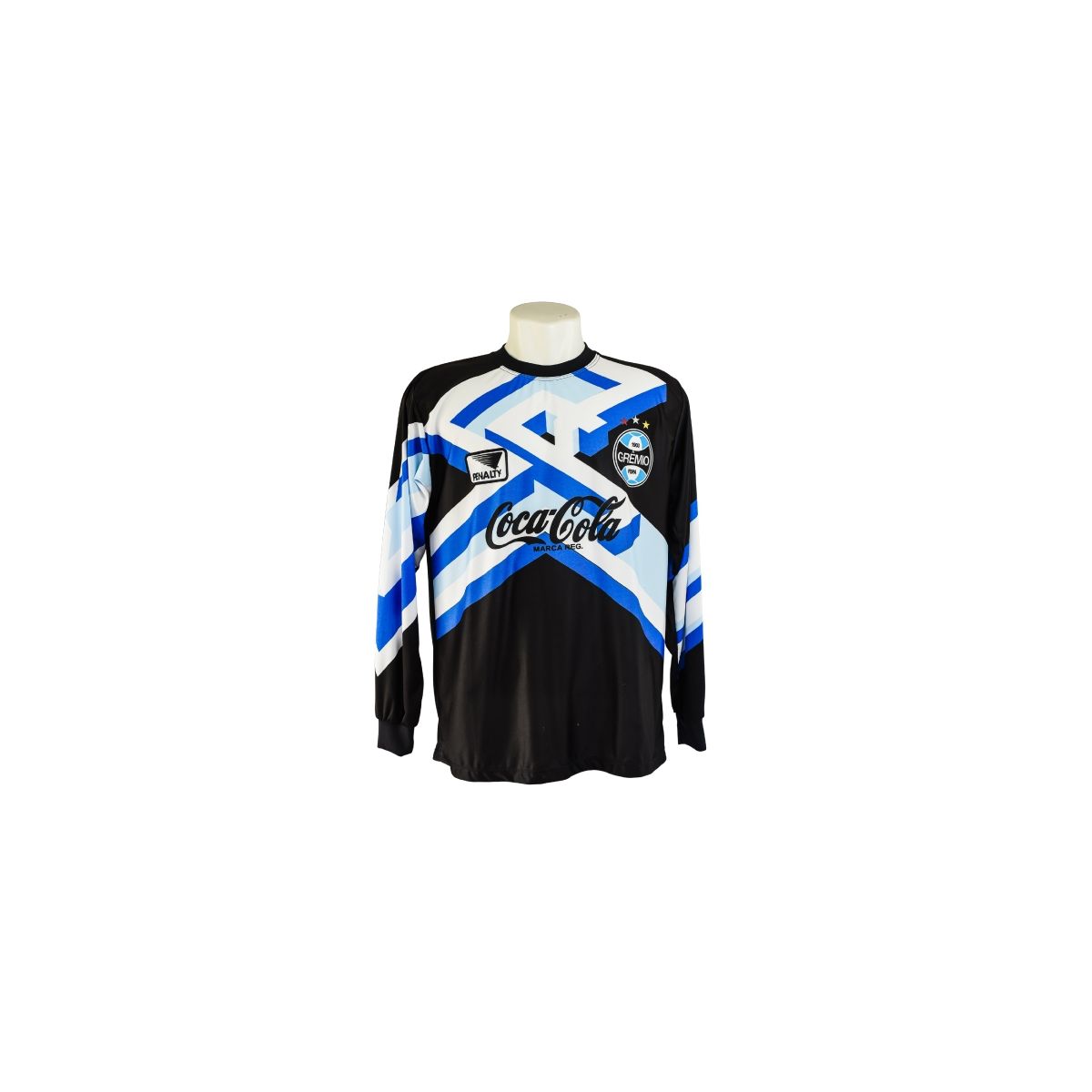 A camisa de goleiro do Grêmio Foot-Ball Porto Alegrense de 1993 , fabricada pela Penalty , é um dos modelos mais marcantes do início da era moderna dos uniformes do clube. O design traz uma combinação imponente de preto, azul e branco , com formas geométricas diagonais que atravessam o peito e as mangas, criando um visual futurista e arrojado para a época.
