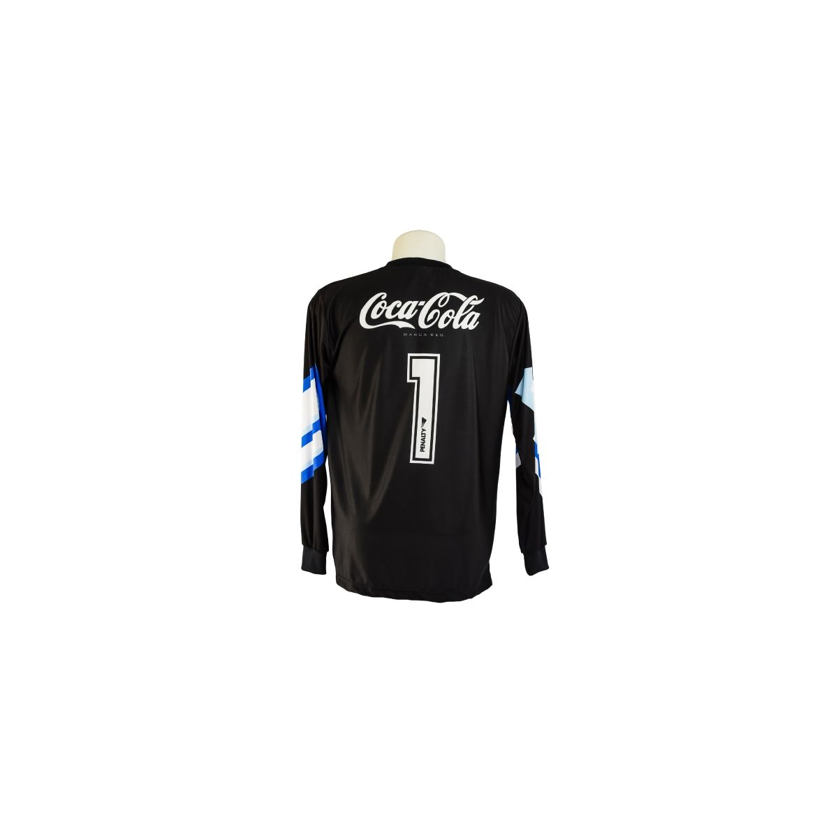 A gola redonda preta e os punhos ajustados dão o toque clássico de uma verdadeira camisa de goleiro dos anos 90, mantendo a elegância e imponência características da posição.