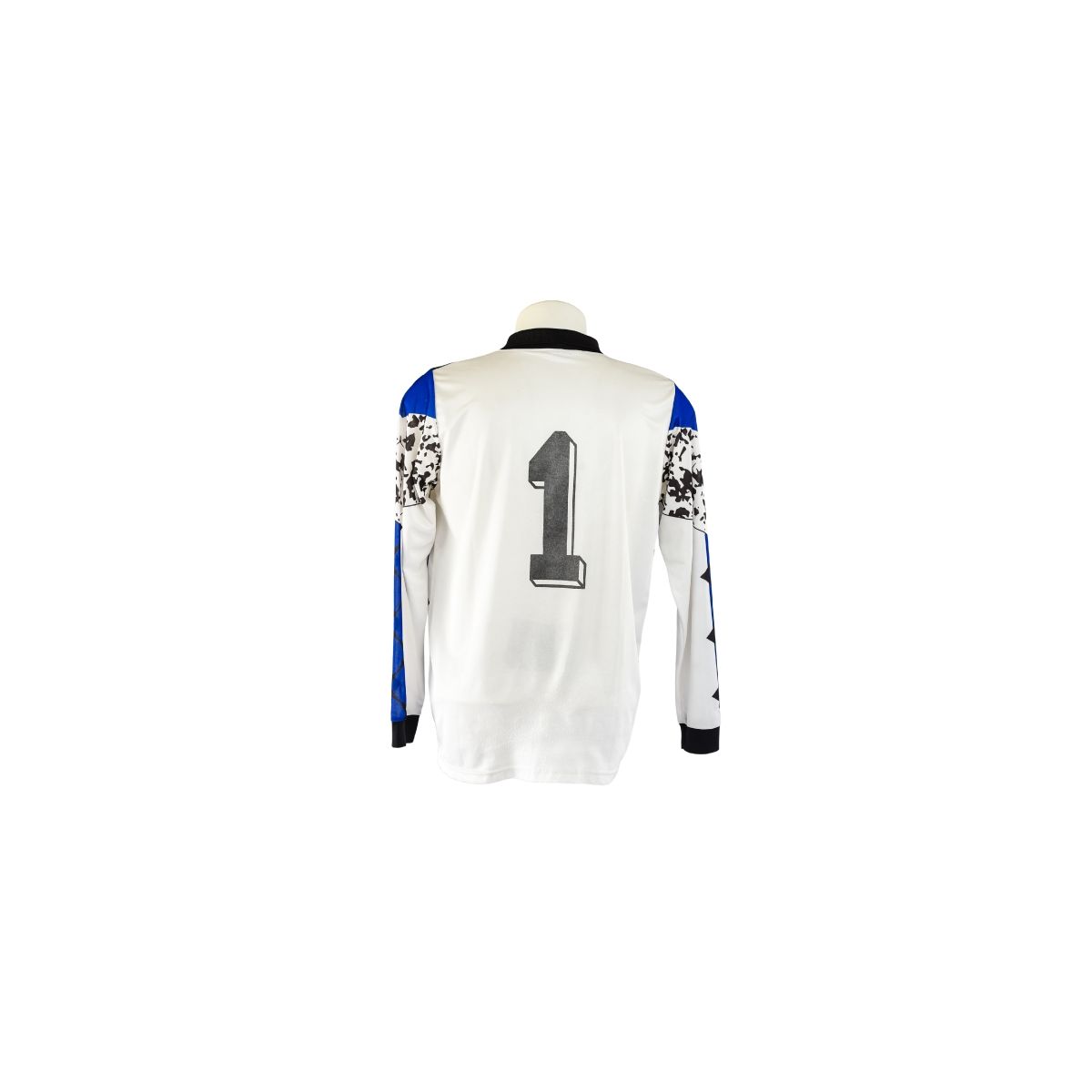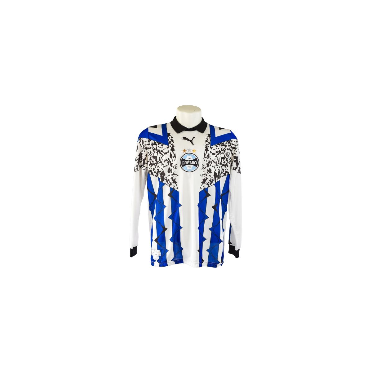 A camisa de goleiro do Grêmio da temporada 1995 , fabricada pela Puma , é um dos uniformes mais icônicos da era vitoriosa do clube nos anos 90. O modelo traz um design ousado e inconfundível, típico da época: manga longa, gola polo preta e uma composição de formas específicas em tons de azul, branco e preto, com detalhes em padrão gráfico irregular no peito — uma verdadeira obra de arte dos gramados.