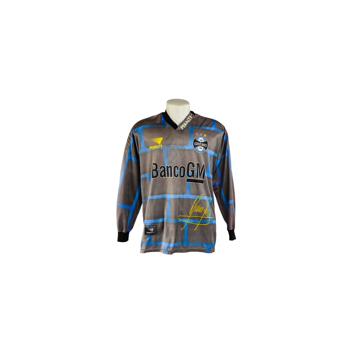 O modelo conta com mangas longas, gola preta com detalhe da marca Penalty , e traz o patrocínio do Banco GM na parte frontal e Chevrolet nas costas, marcas que remetem à parceria da época com o grupo General Motors. O autógrafo de Danrlei estampado em amarelo no peito direito dá o toque final de decoração a essa raridade.