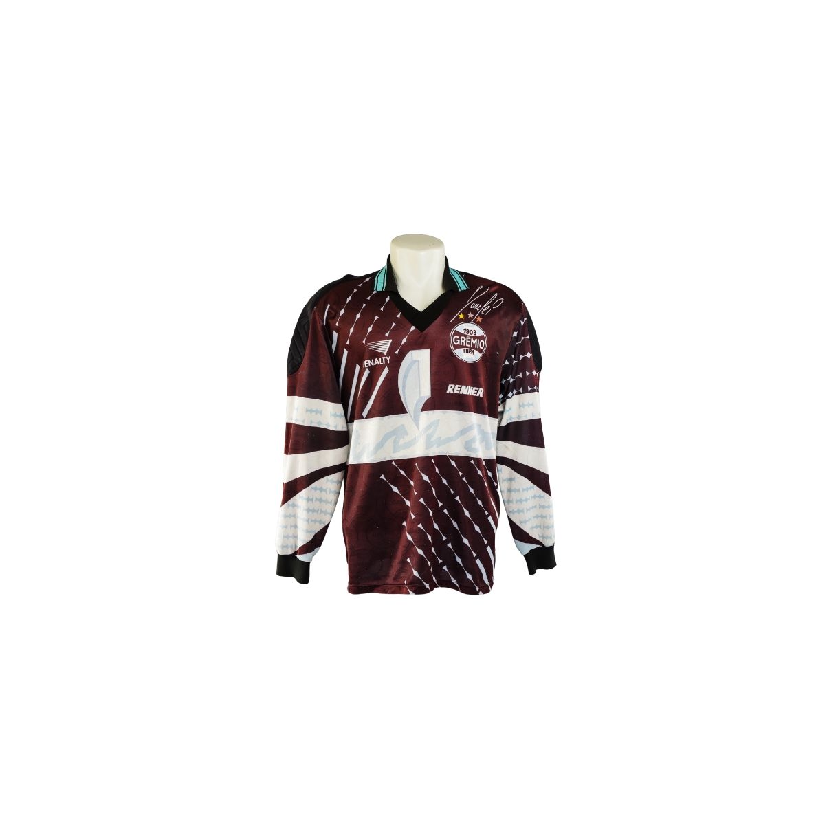 A camisa de goleiro do Grêmio Foot-Ball Porto Alegrense de 1997 , fabricada pela Penalty , é uma das mais marcantes da década de 90. Com um design ousado e inconfundível, o modelo traz a cor vinho com detalhes em branco e azul claro , além de gráficos abstratos que refletem o auge da criatividade da marca na época.