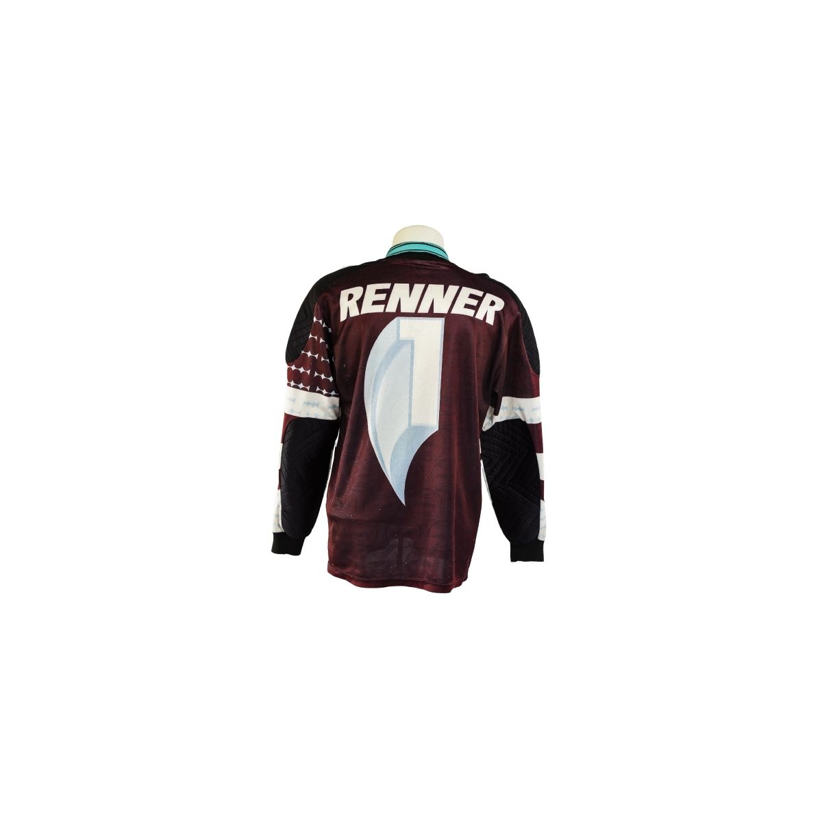 O escudo do Grêmio bordado, o patrocínio estilizado Renner e o númeroado no centro compõem um visual vibrante e único, que se tornou um dos símbolos do final dos anos 90 no futebol brasileiro. O tecido possui textura e acolchoamento nos cotovelos, reforçando o conforto e a resistência típica das camisas de goleiro da Penalty.