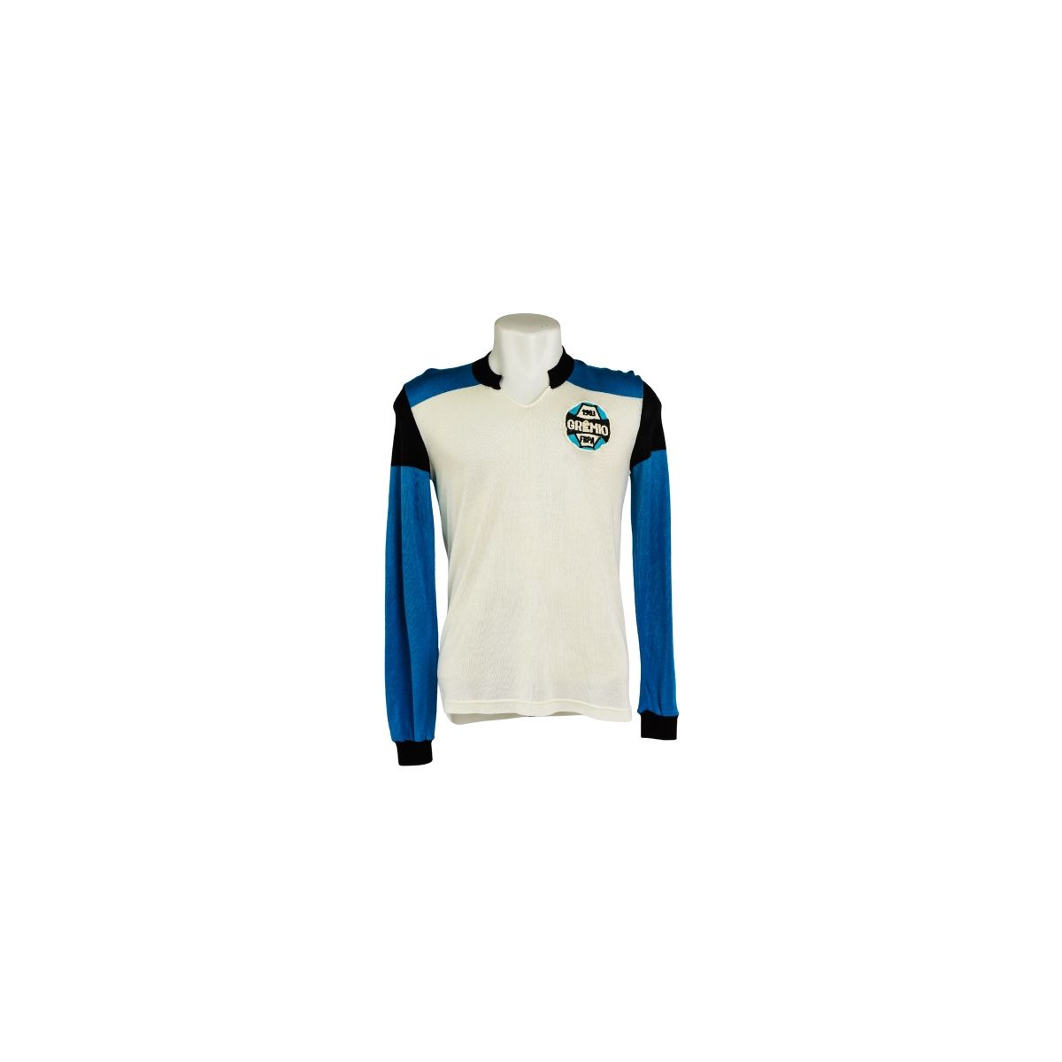 Esta é uma das camisas mais raras e históricas do Grêmio Foot-Ball Porto Alegrense, utilizada na década de 1970. O modelo, de mangas longas, foi confeccionado em tecido leve e macio, característico da época, com predominância da cor branca e detalhes em preto e azul nos ombros e nas mangas.