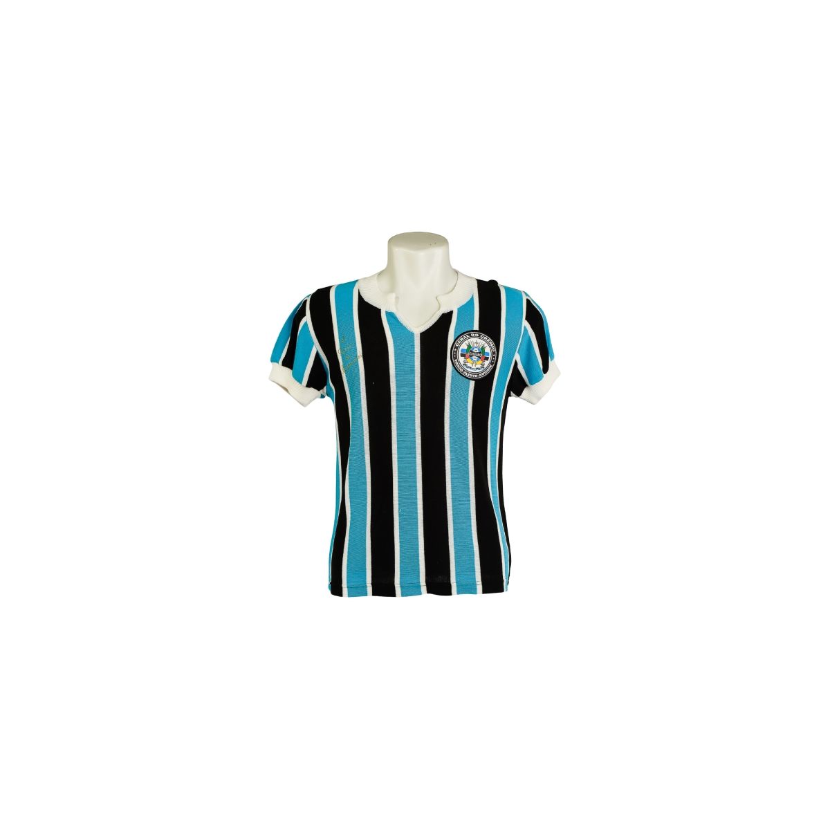 Esta é uma das camisas mais tradicionais da história do Grêmio Foot-Ball Porto Alegrense, utilizada na temporada de 1977, um ano histórico para o clube gaúcho. O modelo apresenta o design clássico com listras verticais em azul celeste, preto e branco, confeccionada em tecido de algodão grosso, característico das camisas da época.