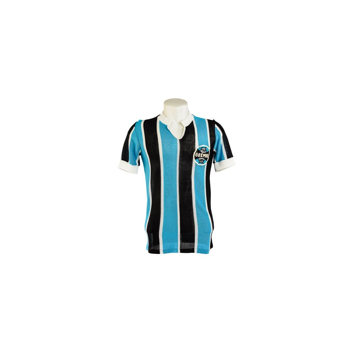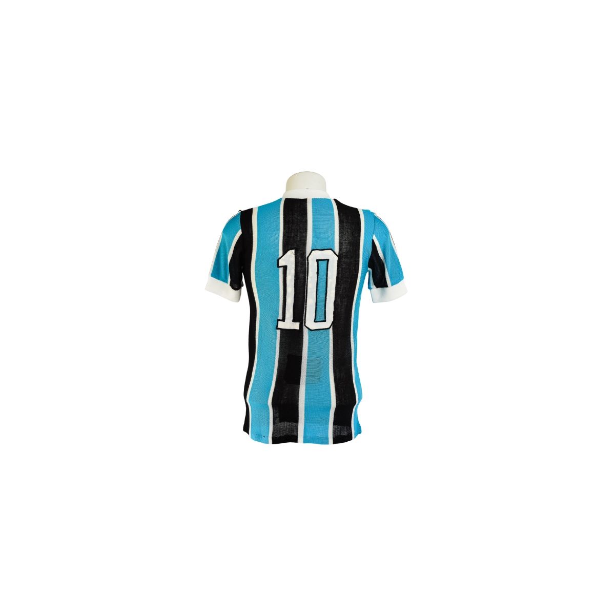 Com as tradicionais listras verticais em azul, preto e branco , a camisa traz o logotipo clássico da Adidas bordado no peito direito e o escudo do Grêmio em formato redondo no peito esquerdo. O número 2 nas costas, impresso em fonte geométrica típica da Adidas, representa os defensores firmes e raçudos daquela geração.