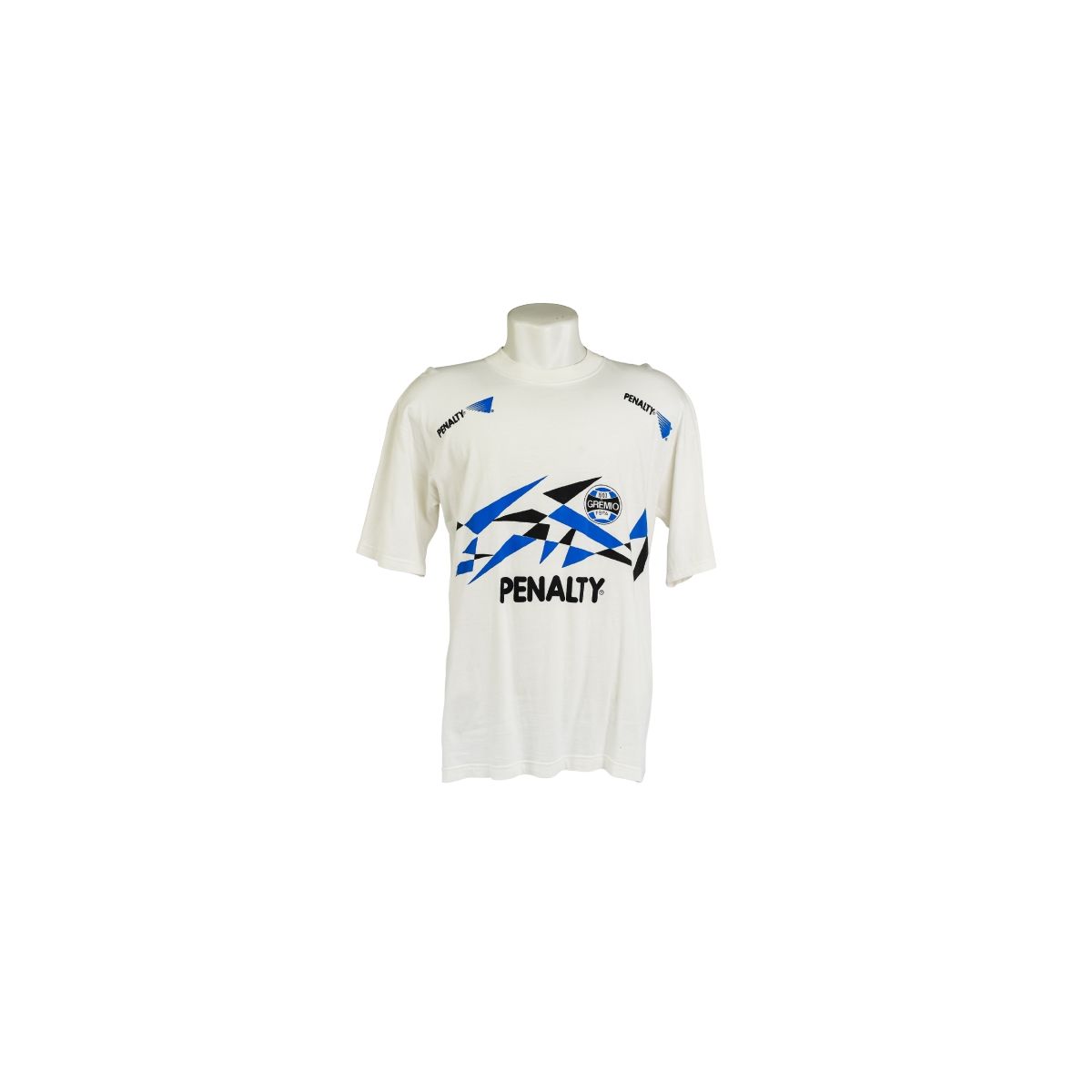 Esta é a clássica camisa branca de treino do Grêmio Foot-Ball Porto Alegrense, utilizada durante a gloriosa temporada de 1995, ano em que o clube conquistou a Copa Libertadores da América. Fabricada pela Penalty, fornecedora oficial do Tricolor nos anos 90, o modelo traz um design marcante com gráficos geométricos em azul, preto e branco na parte frontal — uma estética típica da década.