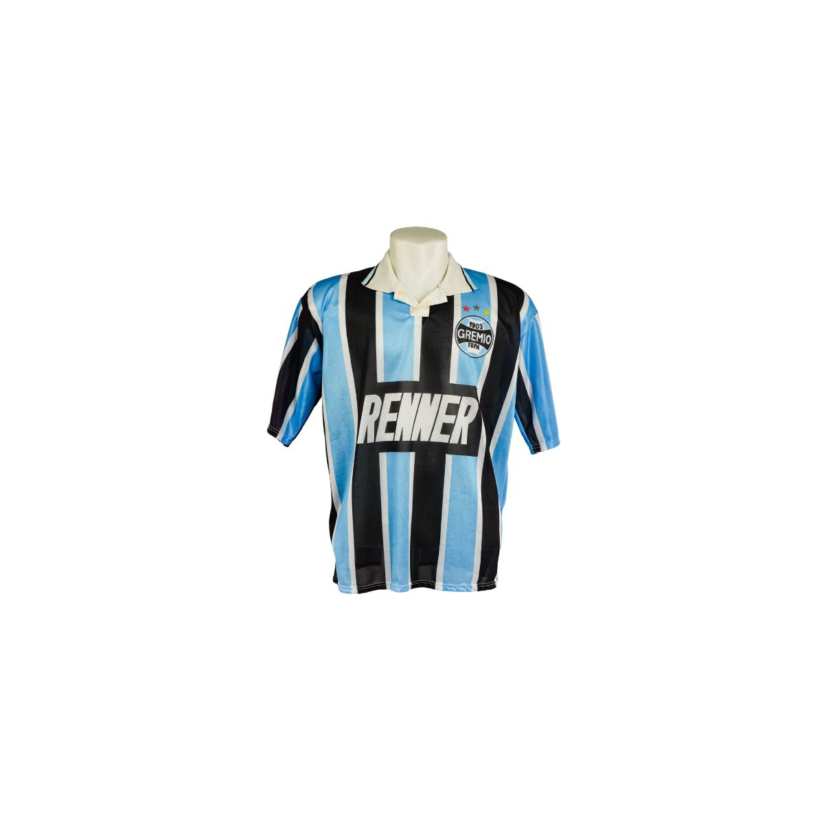 Esta é a clássica camisa tricolor do Grêmio Foot-Ball Porto Alegrense da temporada de 1996, fabricada pela Penalty. O modelo traz as tradicionais listras verticais em azul, preto e branco, com gola polo branca e o icônico patrocínio da Renner estampado em destaque. Foi usada em um dos períodos mais vitoriosos da história do clube, logo após a conquista da Libertadores de 1995 e durante o domínio gremista nos anos 90.