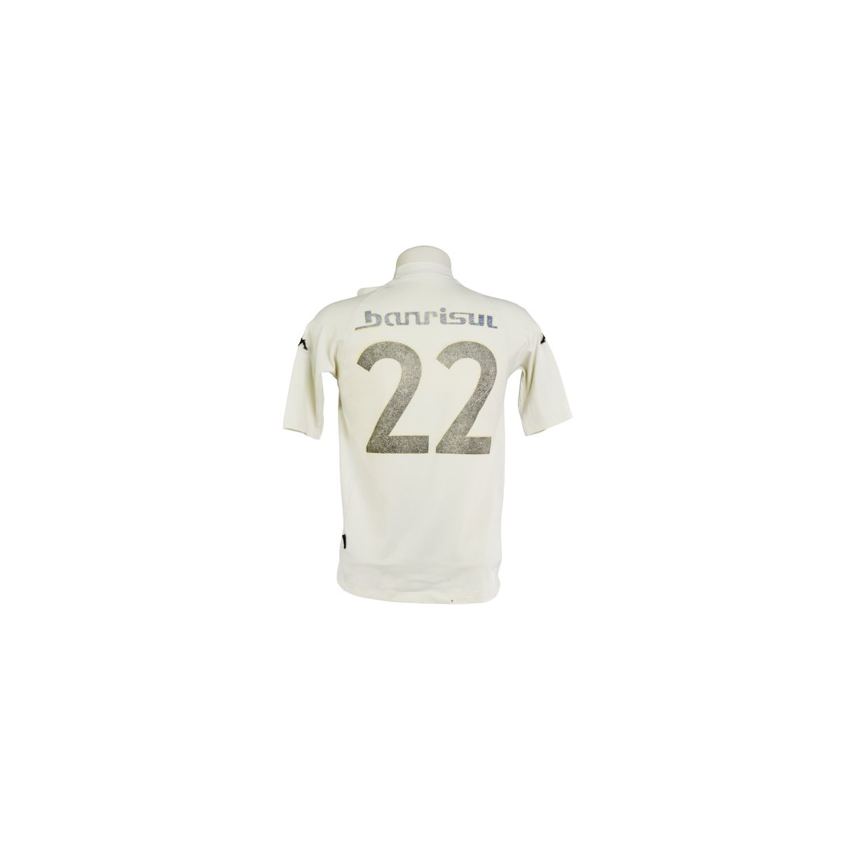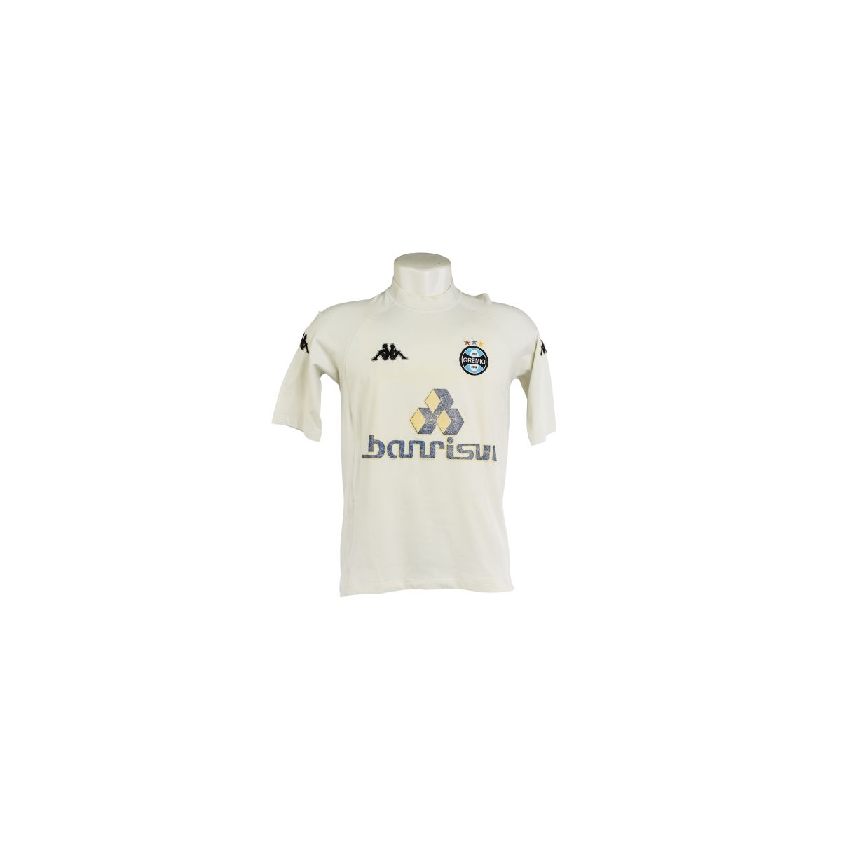 Esta é a camisa branca reserva do Grêmio Foot-Ball Porto Alegrense utilizada na temporada de 2002, fabricada pela Kappa. O modelo apresenta design minimalista e elegante, com corte justo e tecido elástico característico da fornecedora italiana. O escudo do Grêmio é bordado no peito, acompanhado do logotipo da Kappa e do patrocínio Banrisul em tom prateado refletivo, conferindo um visual moderno para a época.