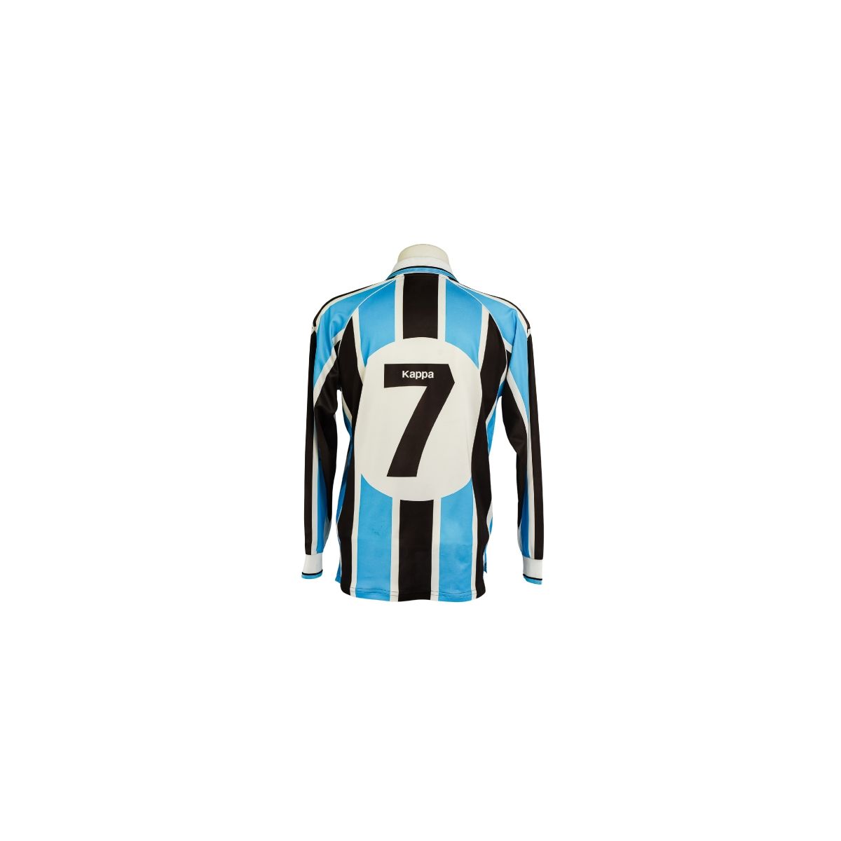 Esta é a tradicional camisa tricolor do Grêmio Foot-Ball Porto Alegrense utilizada na temporada de 2002, fabricada pela Kappa. O modelo apresenta as clássicas listras verticais em azul celeste, preto e branco, com gola em formato “V” e mangas longas, características marcantes das camisas da época. O escudo do clube e o logo da Kappa estão bordados, transmitindo a identidade tradicional do Tricolor Gaúcho.