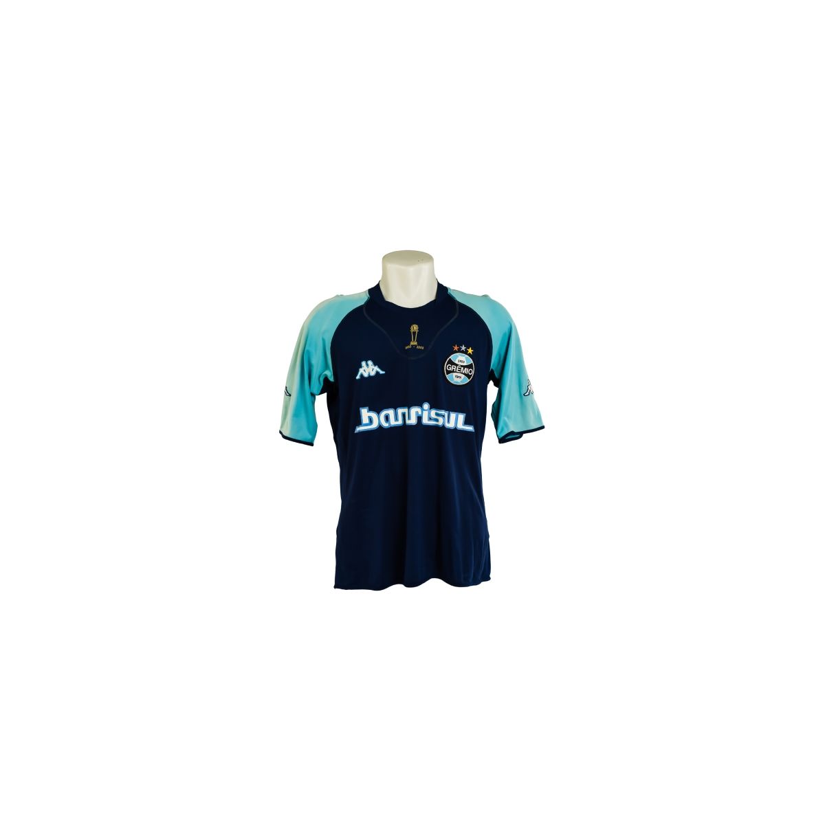 Esta é a camisa azul-marinho do Grêmio Foot-Ball Porto Alegrense utilizada na temporada de 2003, fabricada pela Kappa. O modelo apresenta um design moderno e elegante, com mangas em tom celeste contrastando com o corpo azul-marinho. No centro do peito, o patrocínio do Banrisul aparece em destaque, acompanhado do tradicional emblema do clube com as três estrelas acima do escudo.