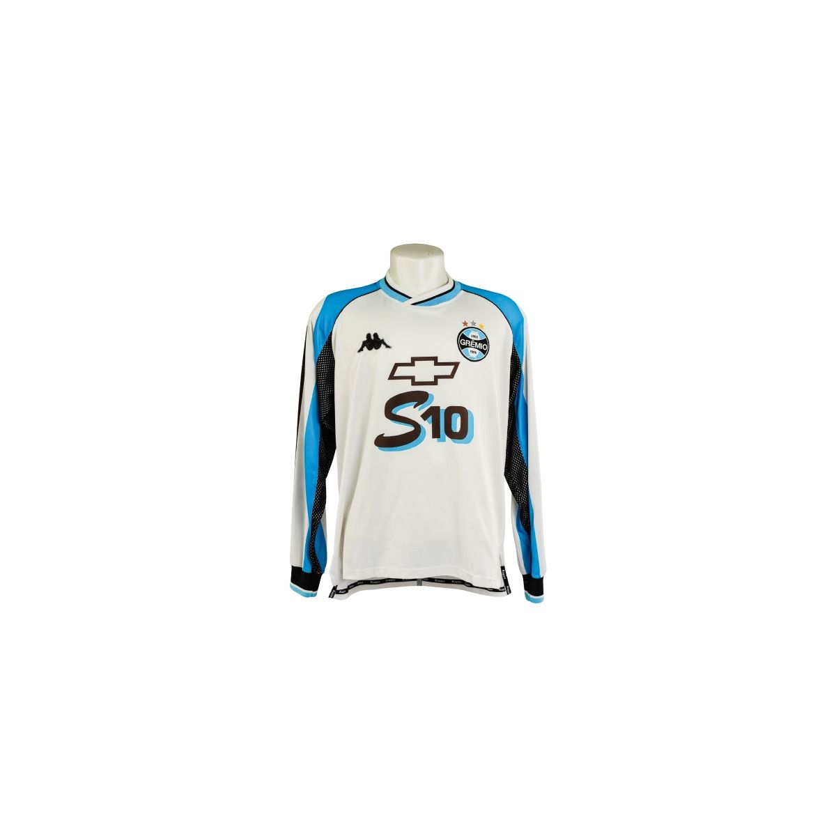 Esta é a camisa branca do Grêmio Foot-Ball Porto Alegrense utilizada na temporada de 2003, fabricada pela Kappa. O modelo servia como uniforme alternativo e traz o tradicional design da fornecedora italiana, com detalhes em azul celeste nos ombros e laterais, além de painéis em preto e azul nas mangas. O patrocínio principal é da Chevrolet, destacando a marca da S10, em alusão à parceria firmada naquele ano.
