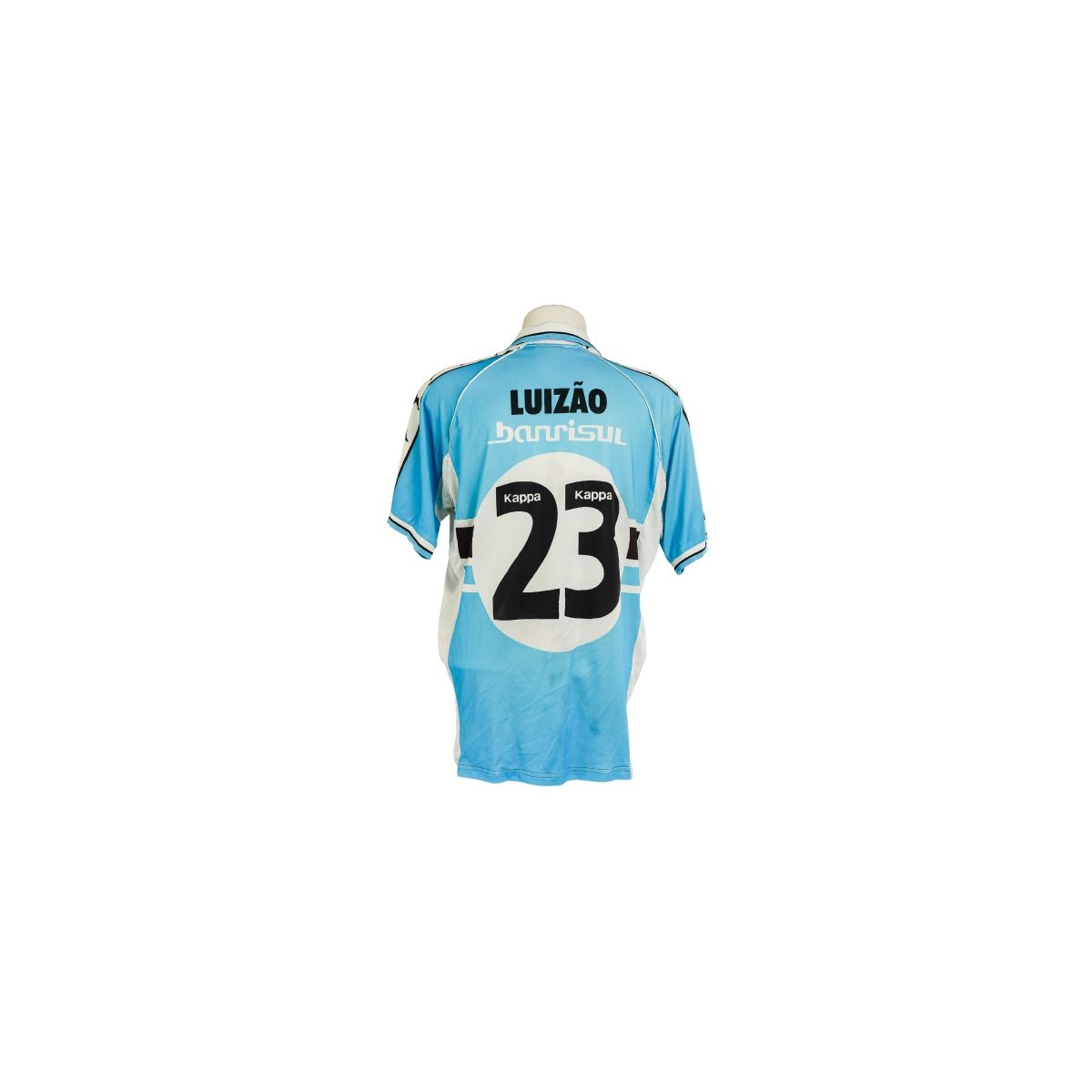 A camisa pertence ao centroavante Luizão, um dos grandes nomes do futebol brasileiro nos anos 1990 e 2000, que teve uma breve passagem pelo Grêmio em 2004. O número 23 está estampado em preto sobre um grande círculo branco, característico dos modelos da época.