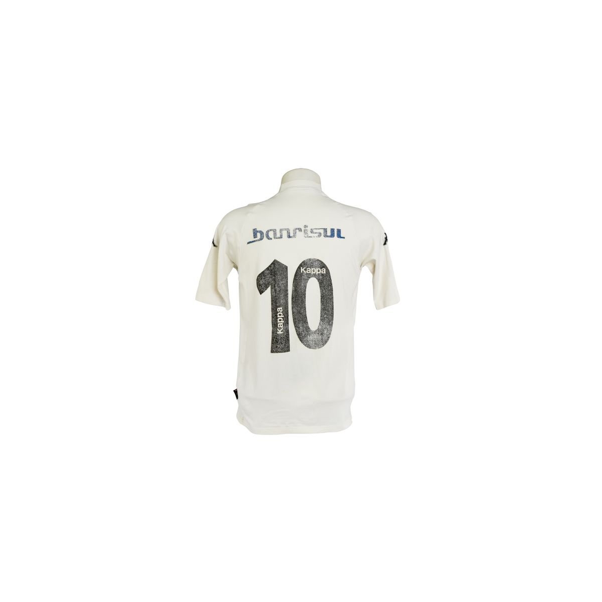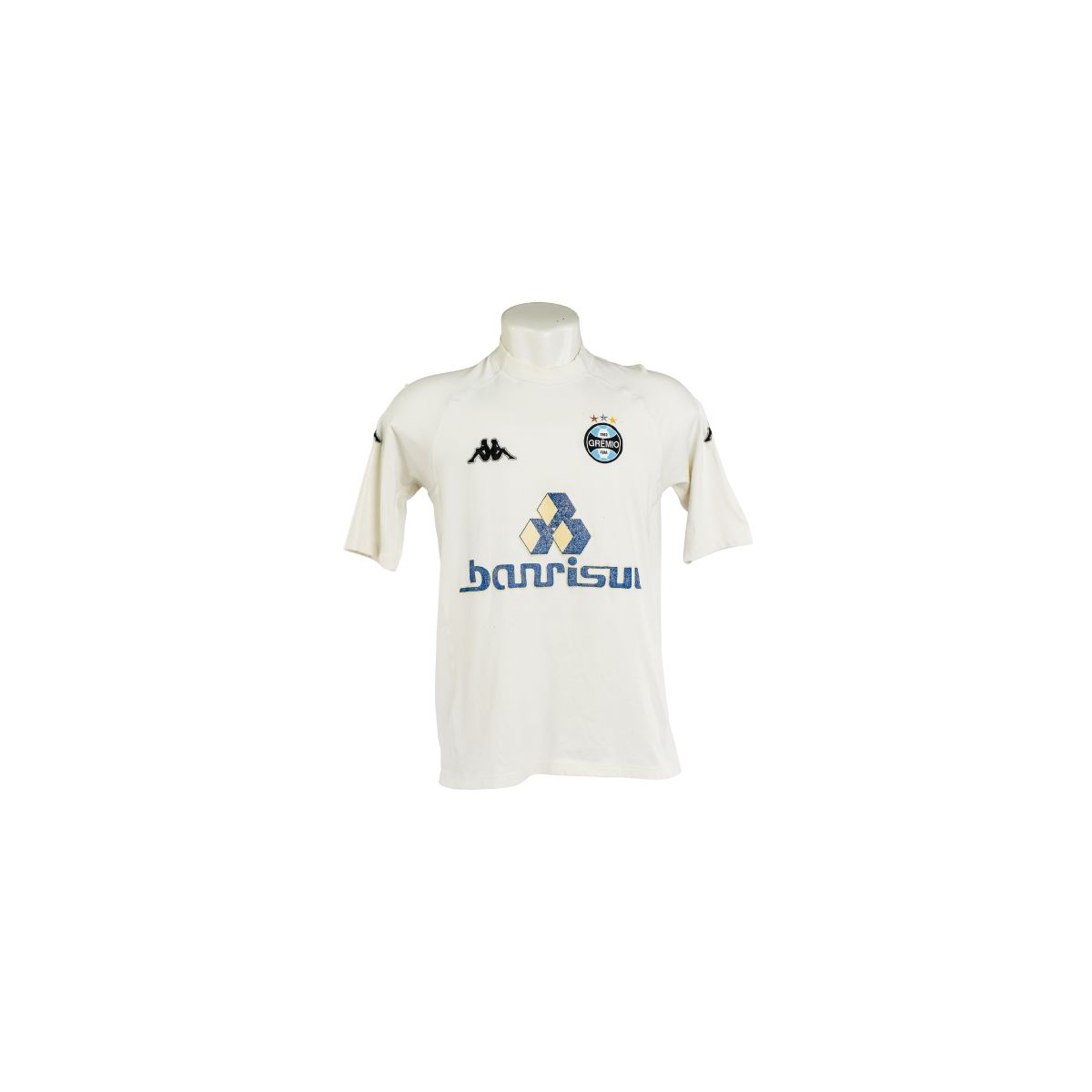 Esta é a camisa branca do Grêmio Foot-Ball Porto Alegrense utilizada na temporada de 2005, fabricada pela Kappa. O modelo foi uma das versões reservas do uniforme, apresentando um design minimalista, com gola redonda e o patrocínio da Banrisul estampado em destaque no centro.