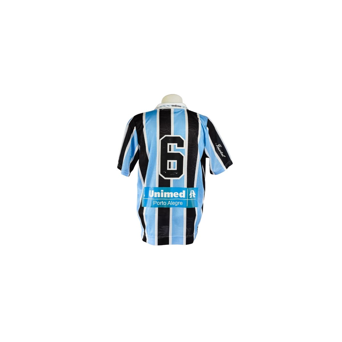 O patrocínio Unimed Porto Alegre está presente na parte frontal e nas costas, e o tecido possui um padrão em relevo com o escudo do Grêmio repetido , um detalhe refinado que remete à exclusividade dos uniformes de jogo da época.