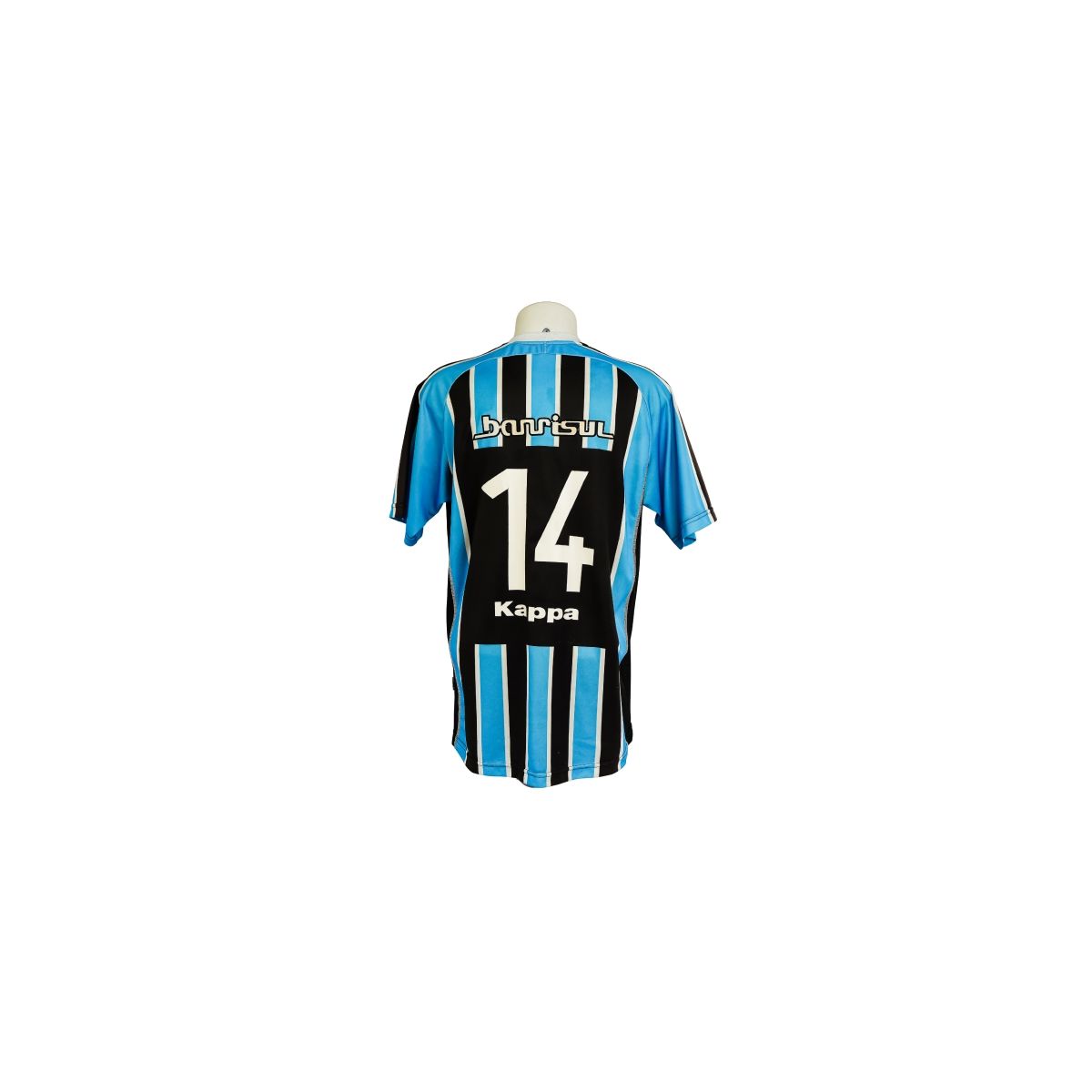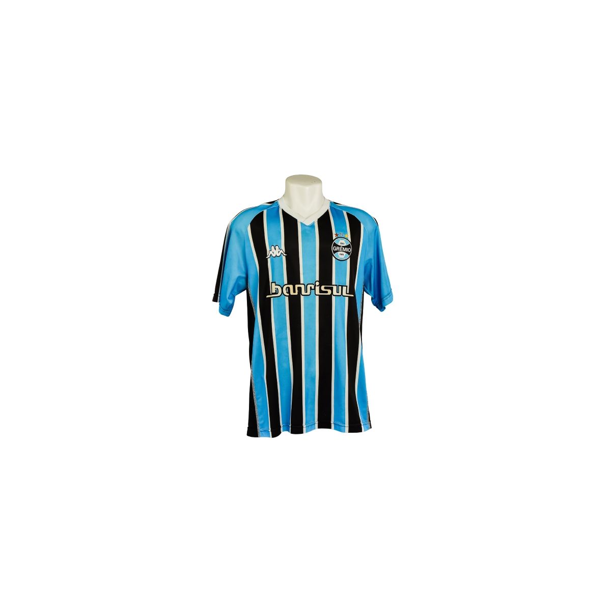 Esta é a camisa tricolor do Grêmio Foot-Ball Porto Alegrense utilizada na temporada de 2008, fabricada pela Kappa. O modelo apresenta as tradicionais listras verticais em azul, preto e branco, com gola em formato “V” e patrocínio da Banrisul estampado na parte frontal.