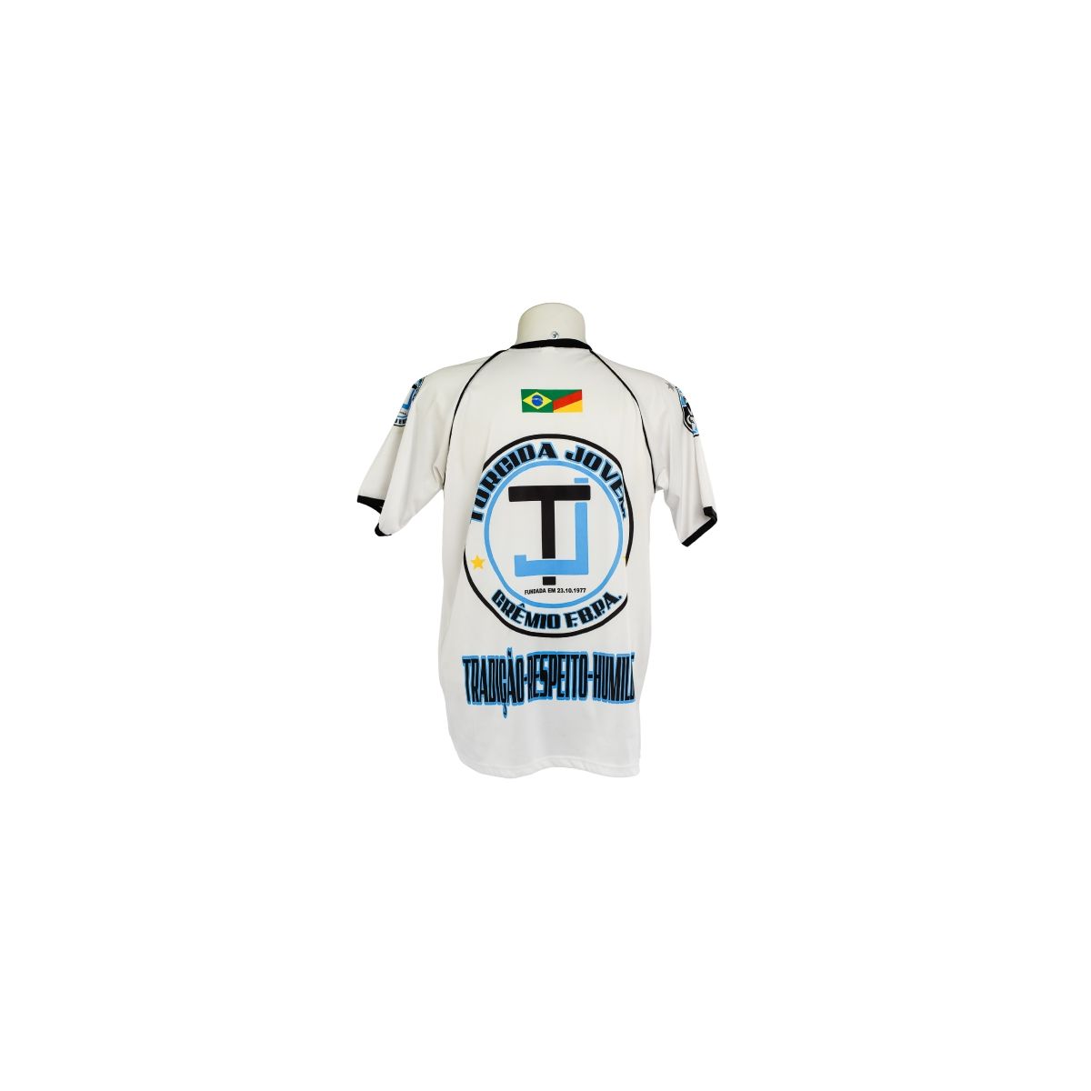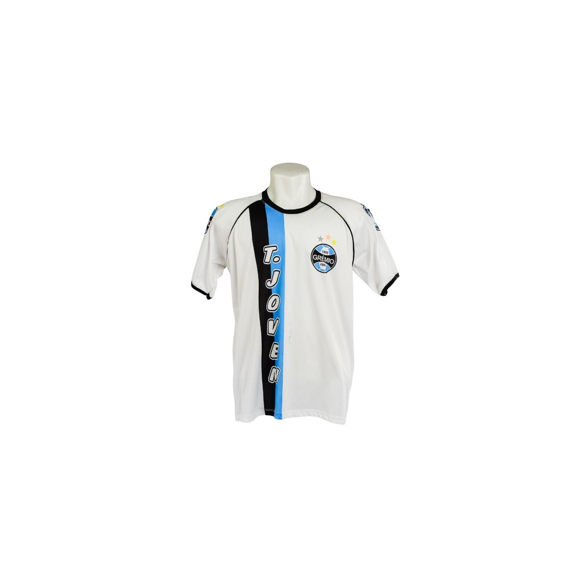 Esta camisa foi criada pela Torcida Jovem do Grêmio, uma das mais tradicionais torcidas organizadas do clube, fundada em 23 de outubro de 1977. O modelo traz o design clássico em branco, com uma faixa vertical nas cores azul e preta — representando as cores oficiais do Tricolor Gaúcho — e o nome “T. Jovem” em destaque na parte frontal. O escudo do Grêmio aparece no peito, com as três estrelas simbolizando as maiores conquistas da história do clube.