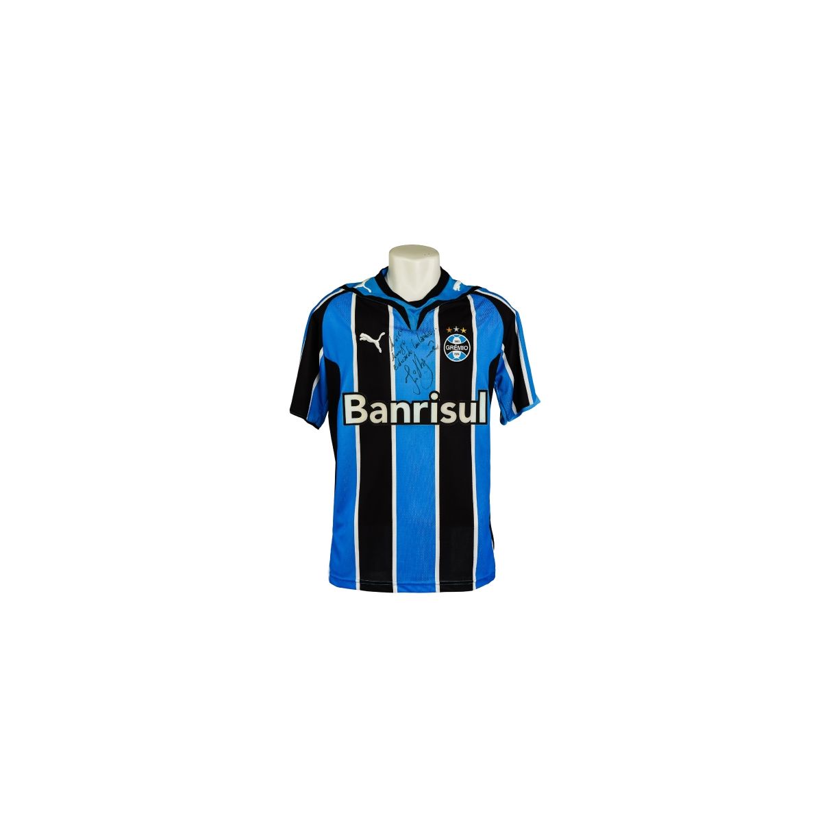 Esta é a camisa tricolor do Grêmio Foot-Ball Porto Alegrense utilizada na temporada de 2013, fabricada pela Puma, marca que vestiu o clube entre 2012 e 2014. O modelo apresenta as tradicionais listras verticais em azul celeste, preto e branco, com gola em formato “V” estilizada e detalhes em preto nos ombros.