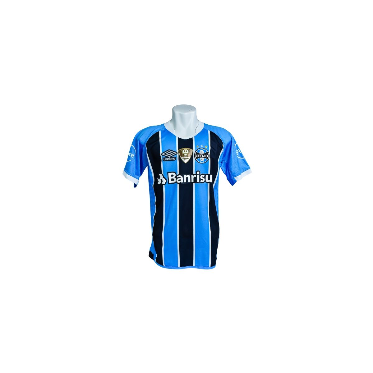Na parte frontal, destacam-se o escudo do Grêmio com as estrelas, o selo comemorativo aplicado no centro do peito, o logotipo da Umbro e o patrocínio Banrisul, compondo um conjunto equilibrado e alinhado aos modelos oficiais de competição.