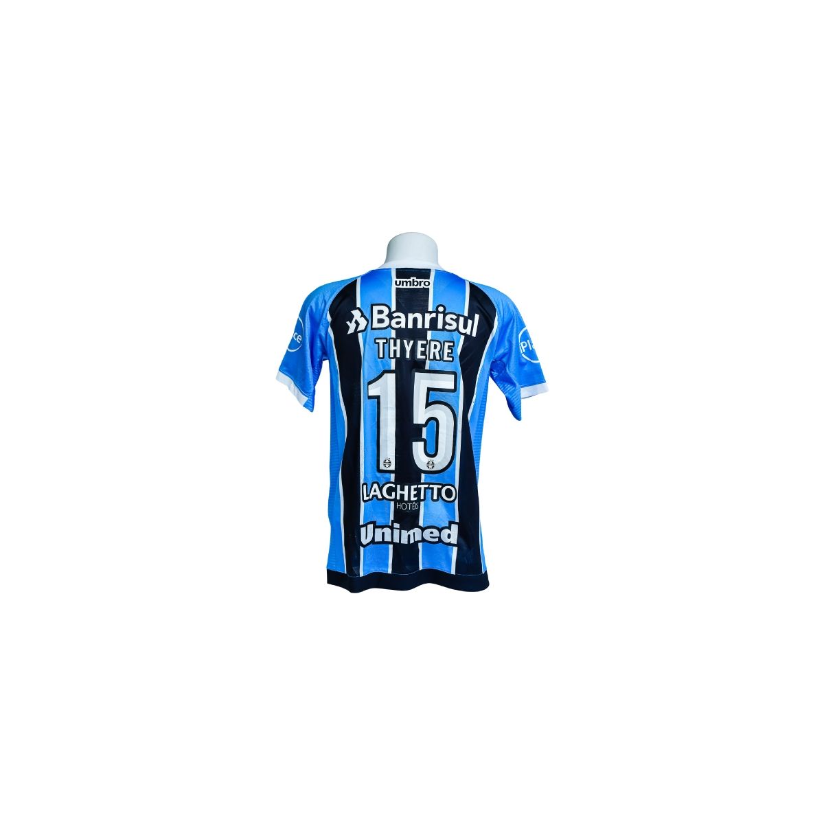 Nas costas, a camisa traz o nome Thyere e a numeração 15, além dos patrocínios Laghetto Hotéis e Unimed, conferindo identidade e autenticidade ao modelo.