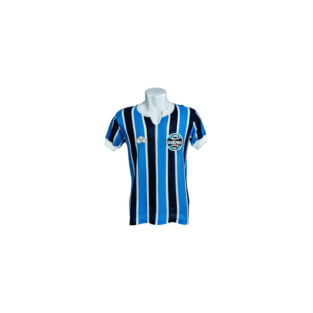 Na parte frontal, destaca-se o escudo clássico do Grêmio, aplicado no peito, preservando o estilo original da época. O conjunto transmite simplicidade, tradição e forte apelo histórico, sendo uma peça especial para torcedores e colecionadores.