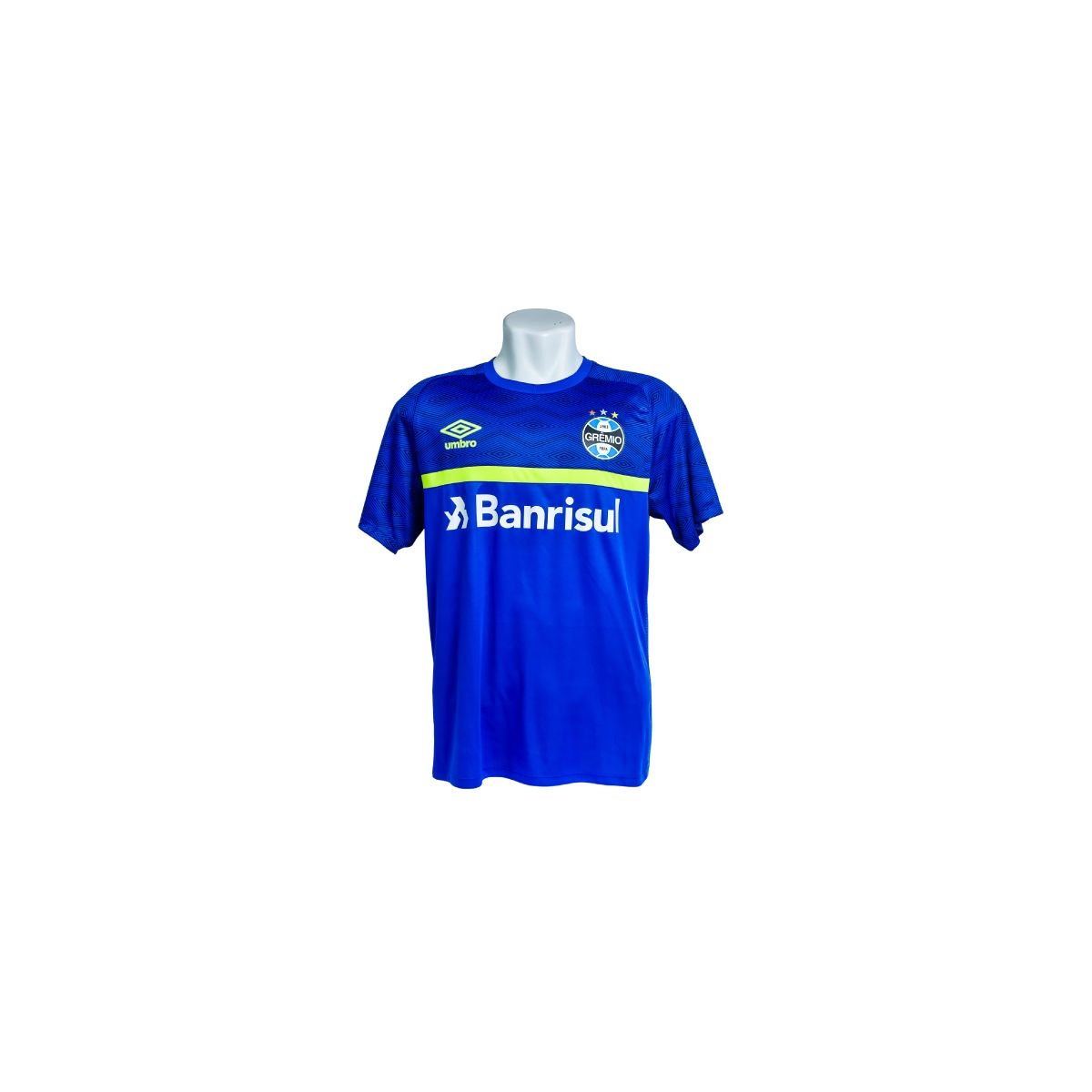O modelo apresenta estampa gráfica discreta no tecido, gola careca e mangas curtas, garantindo excelente mobilidade e caimento esportivo. O escudo do Grêmio é aplicado no peito, reforçando a tradição do clube, enquanto o patrocínio Banrisul aparece em destaque na parte frontal, compondo um visual equilibrado e atual.