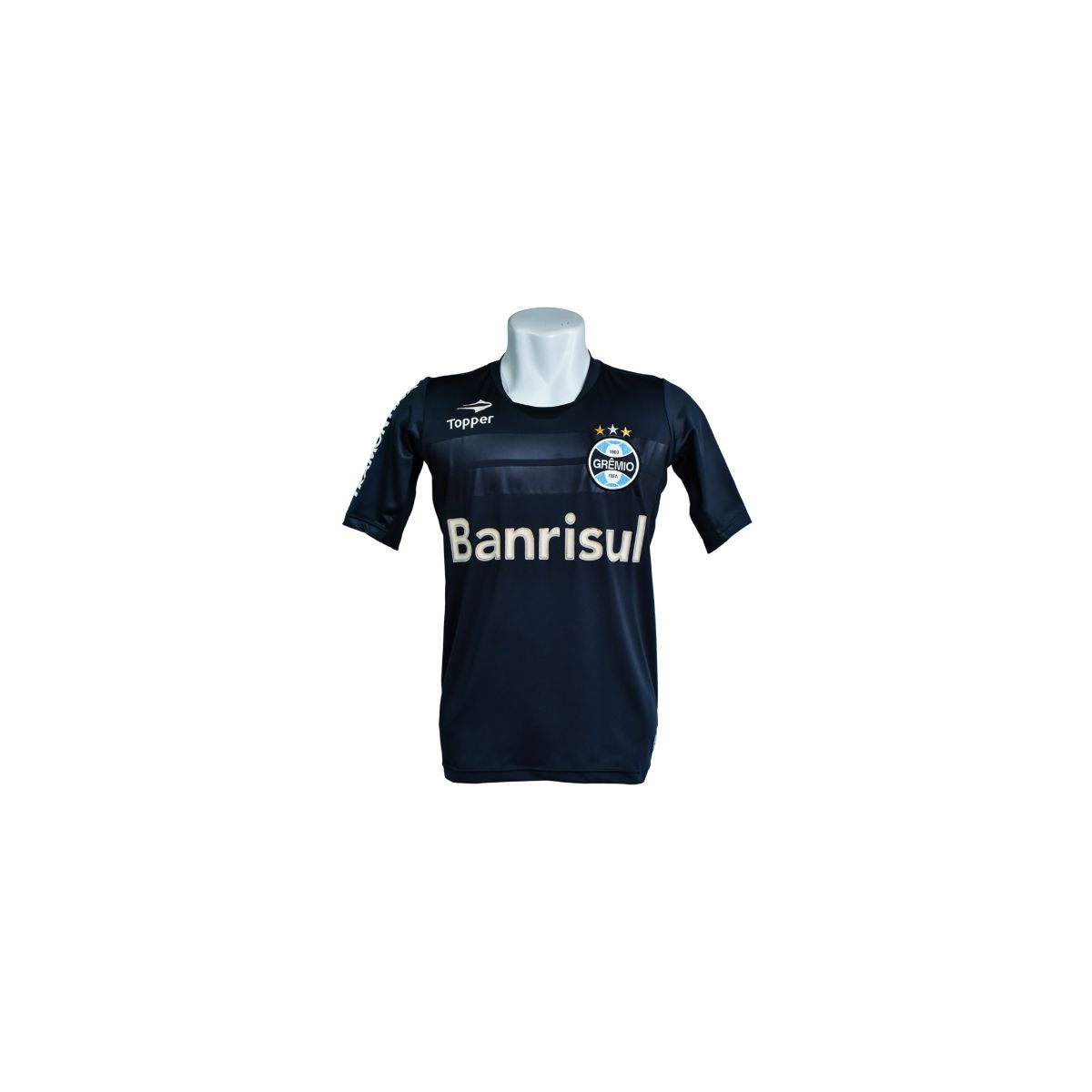 Na parte frontal, destacam-se o escudo do Grêmio aplicado no peito, o logotipo da Topper e o patrocínio Banrisul em evidência, compondo um visual equilibrado e alinhado aos padrões do futebol profissional.