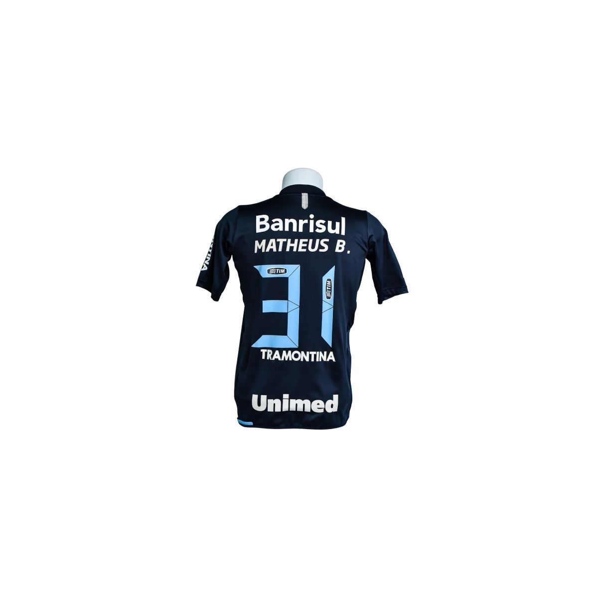 Nas costas, a camisa traz o nome Matheus B. e a numeração 31, aplicados em destaque, além dos patrocínios Tramontina e Unimed, reforçando a estética personalizada e o caráter exclusivo do modelo.