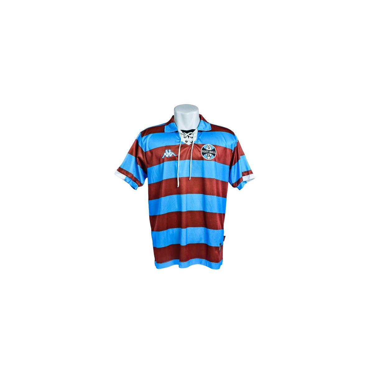As camisas comemorativas de 100 anos do Grêmio são extremamente valorizadas por colecionadores, especialmente aquelas que apresentam cores e designs fora do padrão tradicional do clube. Este modelo, com listras horizontais e gola com cadarço, representa uma homenagem direta às origens do futebol e simboliza um dos momentos mais importantes da história do Tricolor Gaúcho.