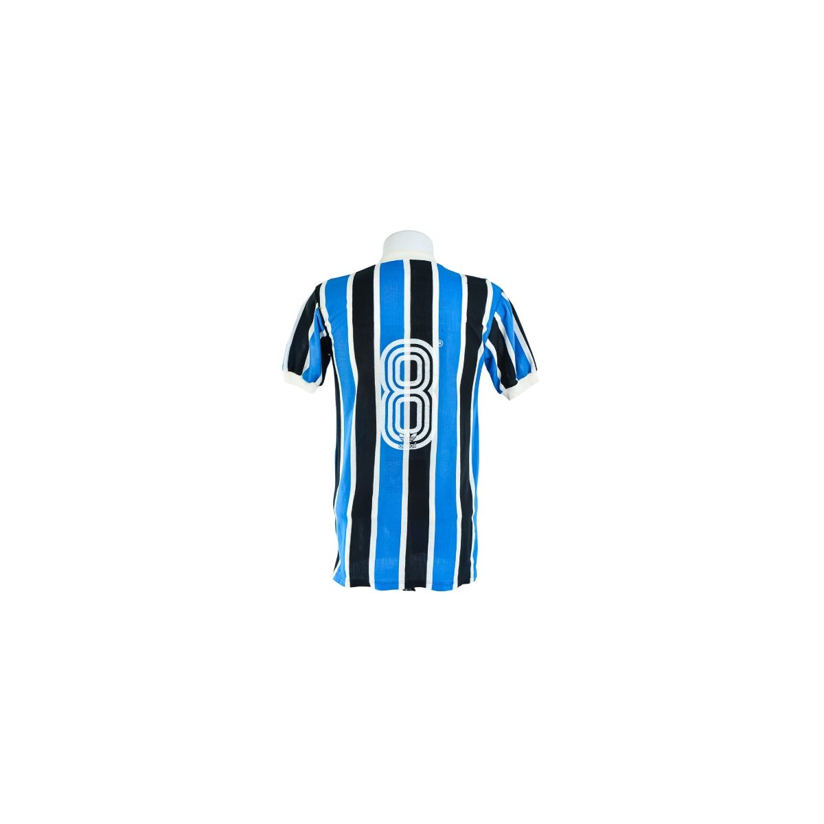 Nas costas, a camisa traz o número #8 em estampa branca com design geométrico, estilo bastante característico dos modelos produzidos no período. Trata-se de uma camisa que simboliza a consolidação da identidade gremista e o início de uma era vitoriosa.