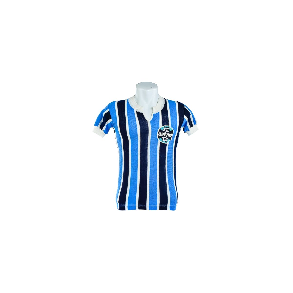 A camisa listrada do Grêmio dos anos 1950/60 é uma peça histórica que remete à fase mais artesanal e romântica do futebol brasileiro. Com as tradicionais listras verticais em azul, preto e branco, o modelo preserva a identidade clássica do Tricolor Gaúcho em uma época anterior à industrialização dos uniformes.