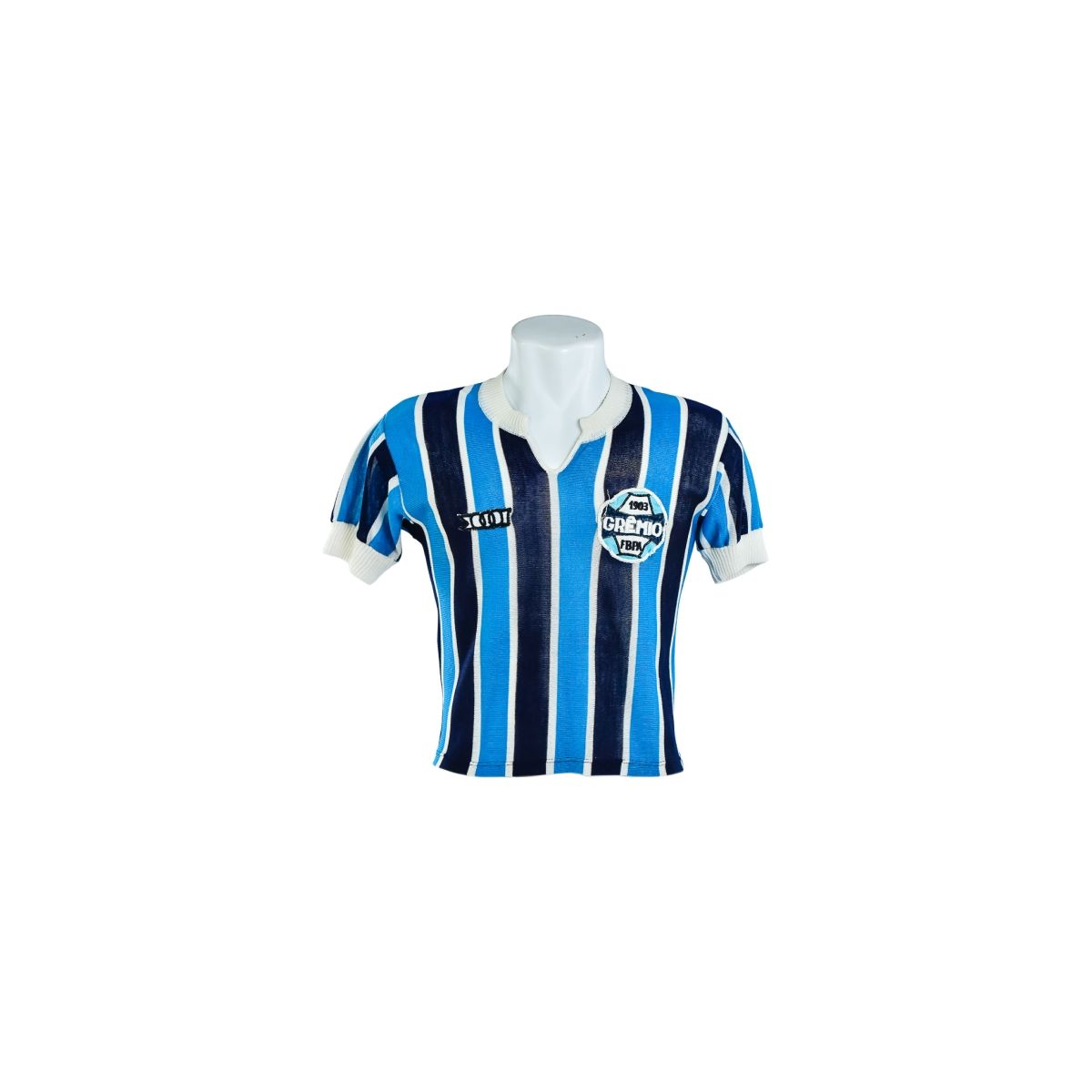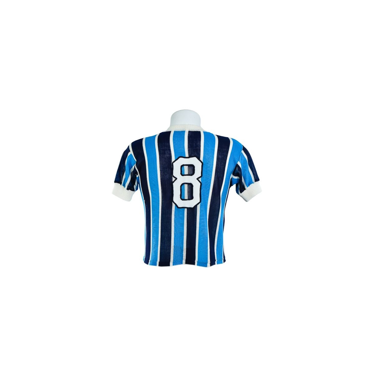 Nas costas, a camisa exibe o número #8 em estampa branca com contorno escuro, aplicado de forma simples e direta, como era comum nas décadas iniciais do futebol profissional. Trata-se de um modelo que carrega forte valor simbólico e histórico, representando o Grêmio de uma era pioneira.
