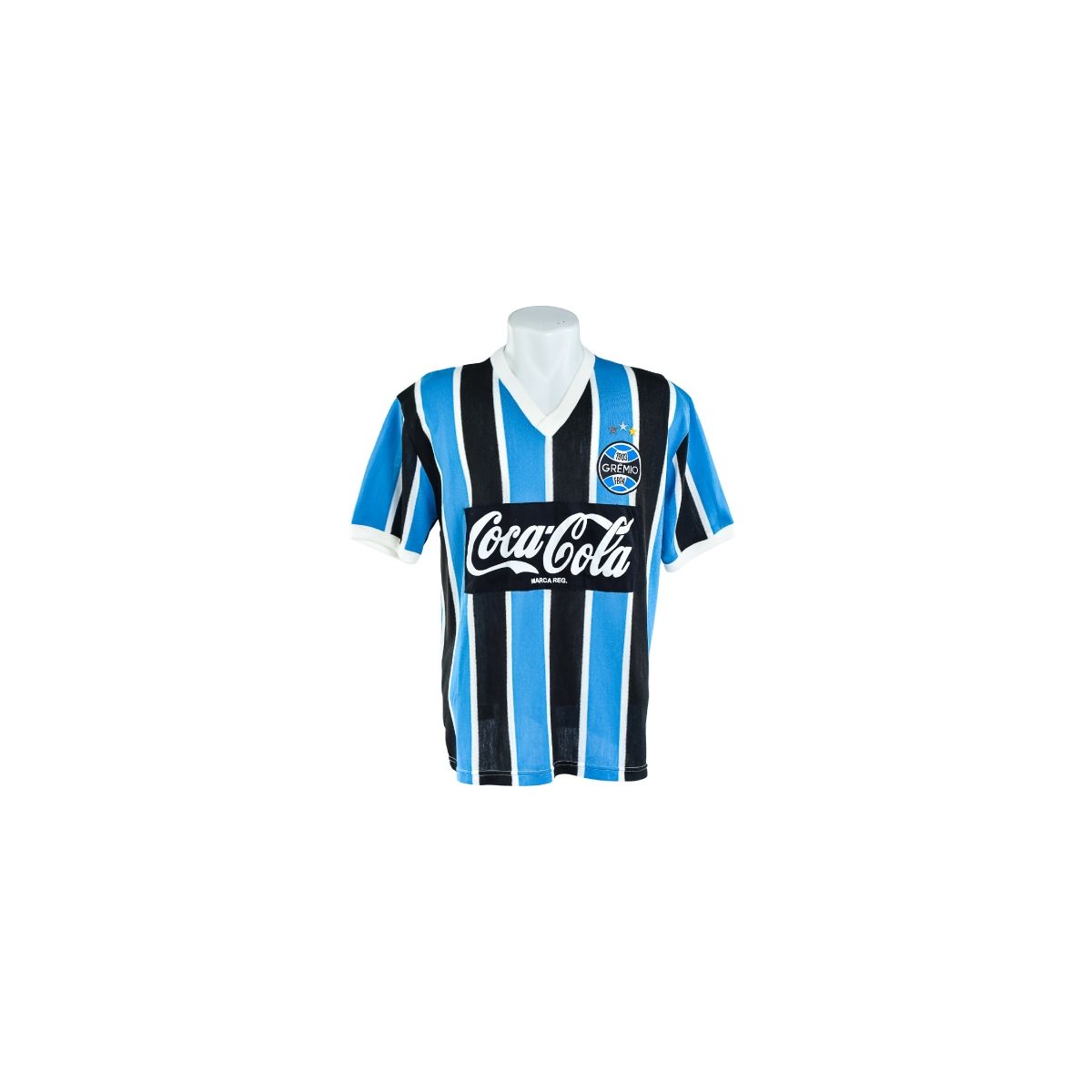 O modelo apresenta gola em V branca, mangas curtas e tecido leve, típico das camisas da época. No peito, o escudo do Grêmio com estrelas aparece aplicado no lado esquerdo, enquanto o icônico patrocínio Coca-Cola – Marca Reg. ocupa posição central em patch preto, criando um contraste visual forte e imediatamente reconhecível.