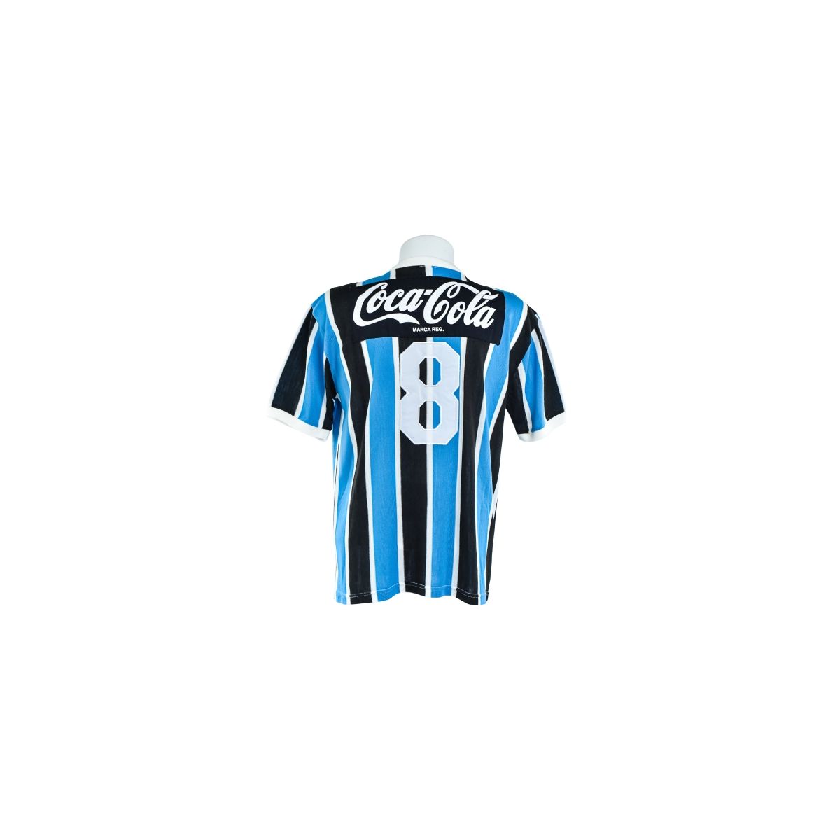 Nas costas, a camisa traz novamente o patrocínio Coca-Cola na parte superior e o número #8 em estampa branca, em fonte clássica e robusta, característica dos anos 80. Trata-se de uma peça que carrega grande valor histórico e simbólico dentro da trajetória gremista.